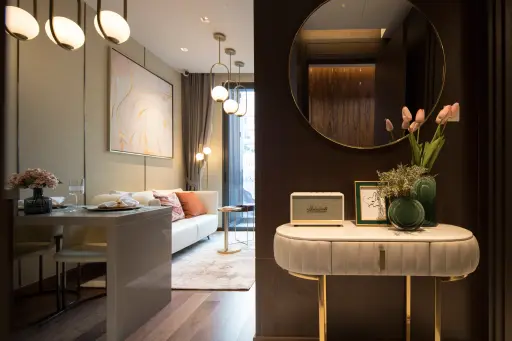 1 Bedroom, 1 Bathroom Condo in Khlong Toei NueaIf you’re looking for a manageable space that feels bright and stylish, this offplan condo could be a solid pick. It’s a compact 29.5 sqm, but the open-plan layout really helps it feel open rather than cramped. You’ll probably spend most of your time in the living area, which gets plenty of natural light thanks to floor-to-ceiling curtains. The white sofa with decorative pillows and sleek wood flooring create a warm, inviting spot to relax or entertain.The design leans modern with touches that add a bit of luxury, like marble flooring with light gray veining and gold accents on furniture pieces — think the legs of the white cushioned vanity stool and the console table. Art lovers will appreciate the abstract framed artwork and the thoughtful decorative touches, like plants and a stylish Marshall speaker for great sound.The bathroom feels fresh and clean with beige tiles, a modern white sink, and a rain shower with both handheld and rainfall heads. Storage is smartly integrated with under-sink cabinets accented by black handles and gold trim.Overall, this place has a polished but comfortable vibe, perfect if you want a tastefully finished home in Watthana with freehold ownership. Being offplan means you can look forward to new, never-lived-in condition when it’s ready.