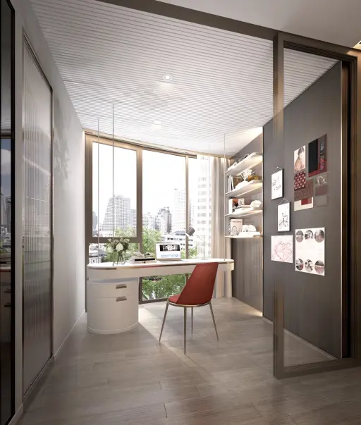 Comfortable Living Right in the Heart of Khlong ToeiThis 32 sqm condo is surprisingly well laid out, making the most of the space without feeling cramped. You walk into an open-concept living area where the living room, kitchen, and workspace all blend together seamlessly. The large window lets in plenty of natural light, so you won’t feel stuck inside even on regular days.The living space feels relaxing with a comfortable white sofa, cushions, and a stylish ottoman—perfect for kicking back or having friends over. The built-in shelves give you room to display books or plants, which adds a nice personal touch without clutter.The bedroom easily fits a king-size bed and has modern built-in wardrobes with sliding doors that save space while offering good storage. The textured 3D accent wall and ambient ceiling lighting add some real character here, so it’s not just a plain box.The kitchen is modern and practical with white cabinetry, stainless steel appliances including a built-in oven and a minimalist dining area that works well for two. If you work from home, there’s a dedicated desk area that’s both functional and comfortable.Overall, it’s a neat, stylish spot that balances function with a clean, contemporary feel. Freehold ownership is a big plus if you’re thinking long term in Bangkok’s central area.