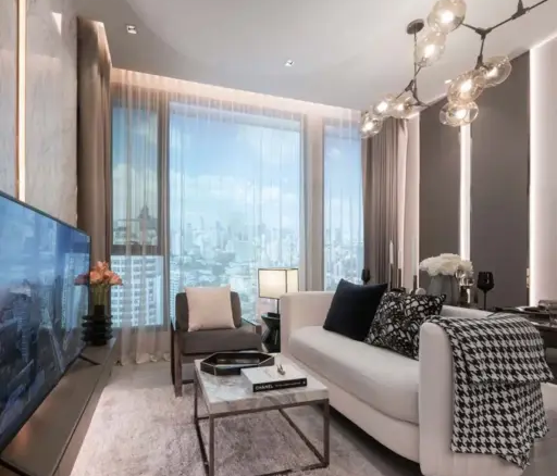Chill in a Contemporary, Light-Filled SpaceThis 45 sqm condo has a really easy, open feel—especially with those large floor-to-ceiling windows that let in tons of natural light while giving you a nice cityscape view. You’ll probably spend most of your time in the open-plan living and dining area, which strikes a great balance between cozy and stylish. The room features a comfy white sofa paired with a gray armchair, plus patterned throws and soft rugs that make the space feel inviting without being fussy.Thoughtful Details That Make a DifferenceIt’s all designed with a neutral palette—mostly gray, white, and beige tones—so it feels modern but timeless. I like the marble accent wall and the vertical lighting, which add personality without overwhelming the space. Built-in shelving with accent lighting gives you a nice spot to show off decor or books, and the recessed ceiling and chandelier lighting create a warm ambiance at night.The glass-top dining table seats four comfortably, perfect if you like to entertain or just want a good dinner spot with a view. Curtains include both sheer and blackout options, so you can control the light however you want.Overall, this condo offers a practical, stylish home with freehold ownership right in the heart of Khlong Tan Nuea. It’s move-in ready and feels both airy and intimate at the same time.