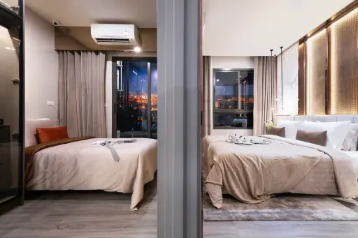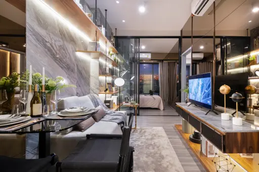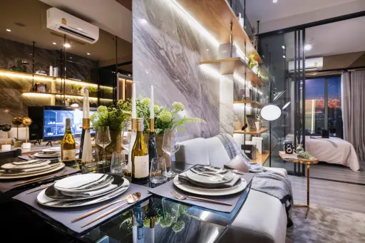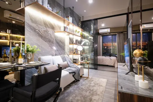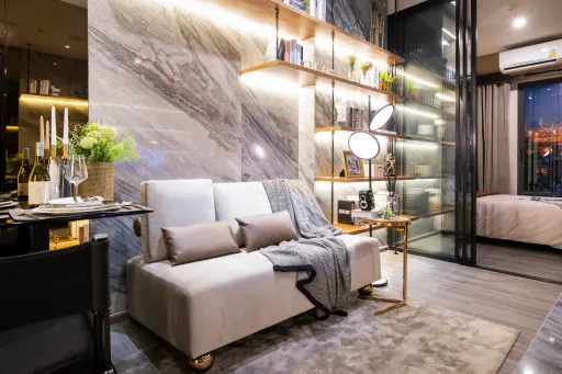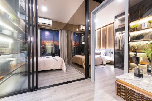 A compact but thoughtfully designed spaceThis 35 sqm condo in Phra Khanong feels way bigger than it is, thanks to the open-plan living and dining area combined with floor-to-ceiling windows that bring in plenty of natural light and offer a great city view. You’ll probably spend most of your time here—the marble accent wall with integrated lighting and the modern sofa make it a comfortable, stylish spot to unwind.Smart separation between living and sleepingInstead of a traditional door, there’s a sliding glass partition between the living room and the bedroom. It gives you privacy without closing off the light or space. The bedroom itself feels cozy with a double bed, blackout curtains, and a walk-in closet with glass-front cabinets illuminated from within, so finding clothes is a breeze.Modern touches throughoutWooden flooring and an area rug add warmthCeiling recessed and ambient lighting create a soft, inviting atmosphereAIR conditioning units in both living and bedroom areas keep things coolGlass-enclosed shower area in the bathroom is sleek and easy to maintainAll in all, this place blends modern convenience and smart use of space, perfect if you want an easy-to-live-in, low-maintenance home with a nice view right in the heart of Bangkok.