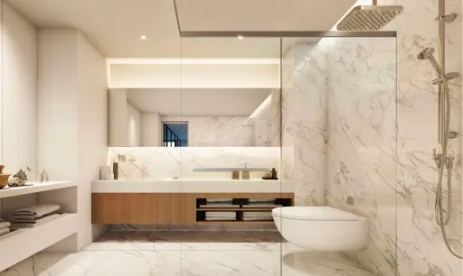Welcome to this smartly laid-out 42.5 sqm condo in the heart of Watthana, perfect if you want a comfortable city pad that feels open yet defined.The space uses an open floor plan, but with a glass partition separating the living room and bedroom, so you get privacy without losing the flow of natural light. You’ll probably spend a lot of time near the large floor-to-ceiling windows — the city skyline view there really sets a nice vibe, especially in the evenings.Inside, the neutral tones and clean lines create a calm, modern feel. The wooden flooring and area rugs add warmth, and you’ve got a cozy sofa with cushions plus a matching armchair, so it’s easy to kick back. The round coffee tables and wall-mounted TV keep it casual and practical.The bedroom is surprisingly spacious with a large platform bed floating against a textured accent wall. The hanging gold bedside lamps and built-in cabinetry keep things elegant but understated. There’s a walk-in closet or dressing area which really maximizes storage.The bathroom is a highlight with marble walls and floors, a walk-in rain shower, floating wooden vanity, and under-cabinet lighting. It’s modern but livable, built for everyday comfort.Overall, this condo feels thoughtfully designed for city living—minimal fuss, great natural light, and smart use of space. It’s freehold, so it’s a solid find if you’re eyeing Watthana.