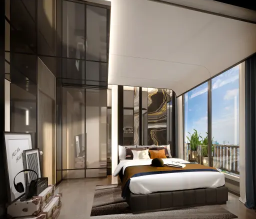 Smartly Designed Open-Plan Condo in Khlong Tan NueaThis 32 sqm one-bedroom unit maximizes its space with a clean, open-plan layout that’s both practical and welcoming. You’ll probably spend most of your time in the living area, which gets plenty of natural light through those floor-to-ceiling windows looking out over the city. It’s a nice touch that helps the place feel airy despite the compact size.The neutral palette with warm accents—think wooden flooring, soft decorative pillows, and subtle wall art—makes the space feel comfortable rather than cold or sterile, even though it’s offplan. The glass partition cleverly separates the bedroom without closing off the flow, so the whole unit feels connected.Practical Features for Everyday LivingBuilt-in wardrobes keep storage tidy without eating into your space.A small dining area with a round table and pendant lighting is perfect for meals or working from home.The vanity desk with an illuminated mirror doubles as a work or grooming spot.Plus, recessed LED lighting and a mix of wood and metallic finishes add a modern yet cozy vibe. All told, this is a turnkey freehold condo in Bangkok’s Watthana district that feels bright and thoughtfully arranged—definitely worth considering if you want a city pad that balances style with practicality.