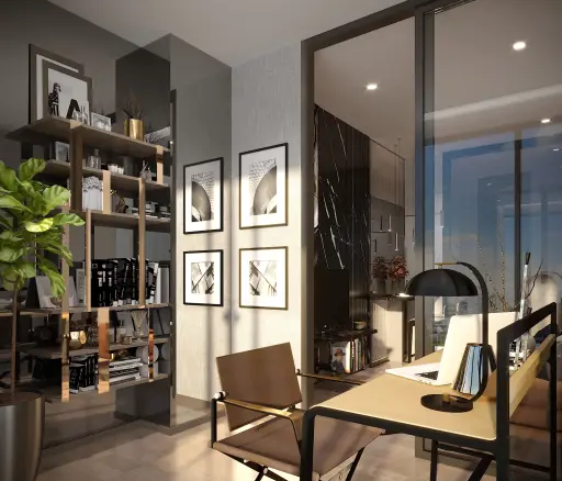 Welcome to this thoughtfully designed 29 sqm condo in Niche Pride EkkamaiIt’s an off-plan one-bedroom unit, so you’ll be getting everything fresh and new. The layout feels surprisingly spacious thanks to a clever open plan design, with the bedroom and living area partially separated by a glass partition—so you get privacy but still enjoy the sense of openness and light. Speaking of light, the floor-to-ceiling windows bring in plenty of natural daylight and offer nice city views that really expand the space visually.Living and bedroom areasThe bedroom is quite plush, featuring an upholstered headboard, a queen-sized bed with soft decorative pillows, and a big built-in wardrobe with reflective sliding doors that help bounce light around. Underfoot, you’ve got warm wooden floors layered with a cozy plush area rug. The living area has a modern brown leather sofa, a low console with a mounted flat-screen TV, and a few tasteful decorative touches that make it feel like home.Dining and finishesFor meals or work, there’s a small dining spot with white chairs and a sleek black marble counter illuminated by modern pendant lights that add some style without fuss. The whole place leans into neutral tones with warm accents and contemporary furnishings—minimalist but welcoming. Reflective surfaces, mirrors, and thoughtful lighting fixtures like recessed and hanging lights keep it bright and airy.If you want a practical, stylish home in Watthana with freedom of ownership and ready to move into soon, this condo’s worth checking out.