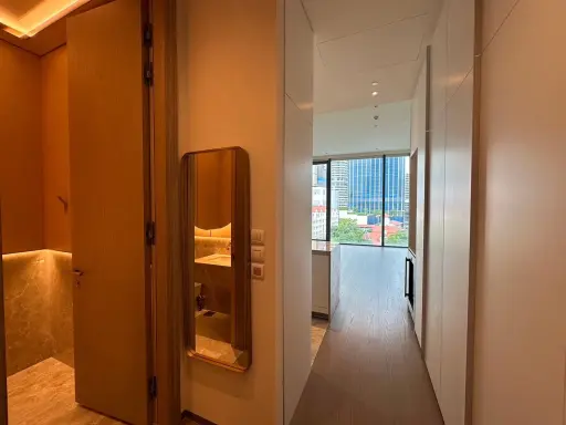 Bright, Open Living in the Heart of BangkokThis 83.6 sqm condo feels surprisingly roomy with its open layout—your living area flows right into a modern kitchen with a handy island and integrated appliances, making it really easy to entertain or just relax after a day out in the city.Natural Light & Views That ImpressFloor-to-ceiling windows in the hallway and living spaces bring in loads of natural light, so the whole place feels bright and welcoming. You get a great view of the city’s mix of sleek skyscrapers, mid-rise buildings with those classic white and beige exteriors, plus some red-roofed touches and plenty of greenery below. The partly cloudy sky adds a nice soft light, not too harsh, which makes the space feel calm despite being right in the vibrant Lumphini area.Thoughtful Details & ComfortTwo bathrooms with marble walls and tasteful finishesWooden floors and neutral walls keep things warm but simpleBuilt-in cabinetry and wall panels for neat storage and styleRecessed ceiling lights and AC vents thoughtfully integrated throughoutOutdoor areas are well-maintained, with landscaped greenery and a swimming pool to unwind. Being freehold in such a central spot makes this a solid choice, whether you’re after a stylish city home or a smart investment.