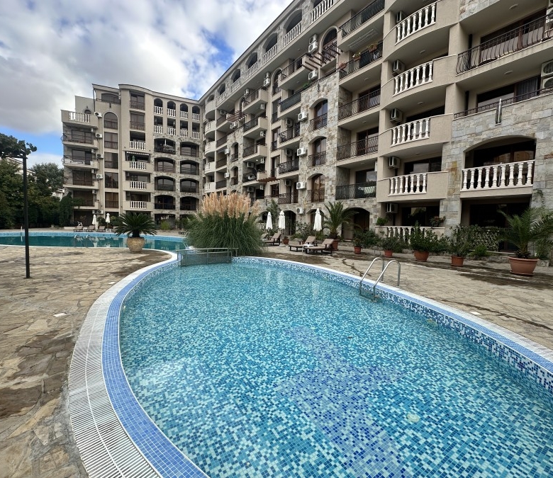 1 BED spacious apartment, 61 sq.m., in Kalia, center of Sunny beach, 250 m to the sea KC Properties is pleased to offer you this fully furnished apartment which boasts of its excellent location. It is situated in Kalia apart-complex, within short distance to main strip (4 min walking), the beach (250 m) and the Aqua Park (300 m). Within short distance there are 4 supermarkets, several restaurants, different shops, pharmacy, bakery, bus stop. The position of the property makes it very suitable for renting out. The complex offers: – Swimming-pool; – Restaurant; – Outdoor bar; – Underground parking; – Full time security; – Spa center; – Lifts Annual maintenance fee is 16.5 EUR/sq.m. The apart-complex offers attractive architecture and top quality finishing. It has all necessary services and facilities for complete relaxation and good rest. The apartment, which is offered for sale, is situated on the 3rd floor and has views to the surroundings. Its total area is 60.5 sq.m. and comprises of: – Open-plan kitchen with lounge area; – One bedroom; – Fully equipped bathroom; – Balcony The apartment is very sunny and light and is offered inclusive of all furniture and equipment. There is fitted kitchen with electric appliances – fridge, washing machine, ceramic cook-top, microwave, sofa-bed, TV, dining set, double bed and wardrobe, 2 air-conditions, bathroom with shower cabin. Support for complex For an annual fee of 16.5 Euro / sq.m and offers the following services : * Organization of Security * Package of sanitary services for the common parts : dusting , ventilation, cleaning , etc. * Technical support for common installations and facilities repairs of the common parts * Maintenance of the green area and adjacent areas * Technical and sanitary maintenance of the pools