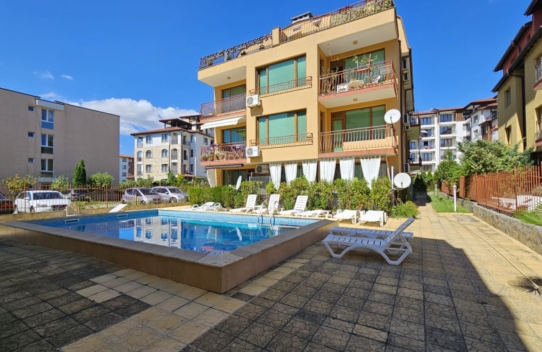 1 BED top floor apartment with a large terrace and sea views, 84 m2, Amoto, Nessebar A two-room apartment is offered for sale in the “Amoto” complex, Nessebar Nessebar is one of the oldest cities in Europe. It is a historical cultural monument under the auspices of UNESCO. A big advantage is that the city’s infrastructure operates all year round, unlike other resort cities. On-site services and facilities: – swimming- pool; – parking; – transfer from/to the airport; – barbecue area. The total area of the apartment is 84 sq.m., located on the 3rd – top floor and consists of: an entrance hall, a bright spacious living room with a kitchenette and dining area, a cozy bedroom, a bathroom with shower and a big terrace offering great views to the sea. The apartment is equipped with furniture, appliances and is ready to move in. Maintenance fee – 6 euros per sq.m. Distance to the beach – 200 m