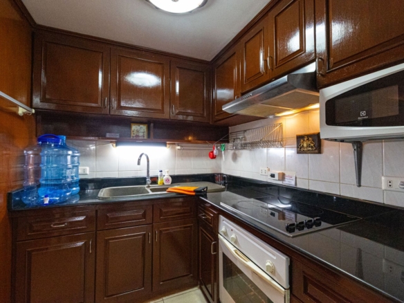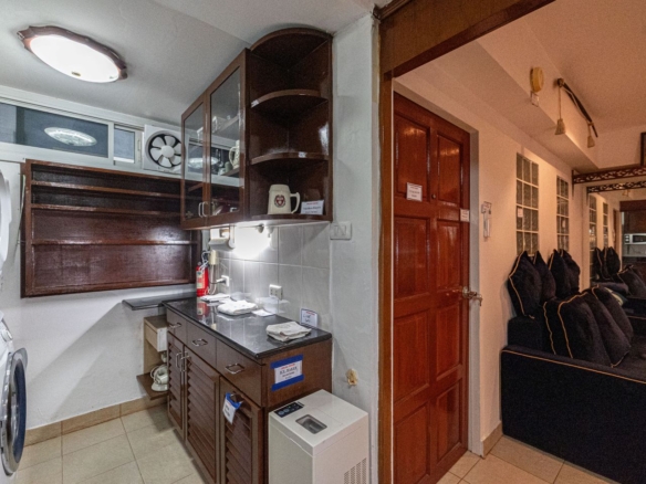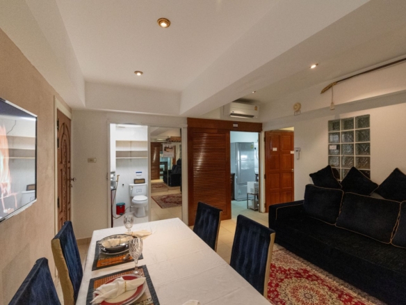 This 1-bedroom, 2-bathroom unit is located in the Center Condotel building in South Pattaya. The layout includes a spacious living area that can comfortably accommodate overnight guests with a sofa bed setup.