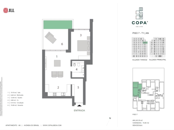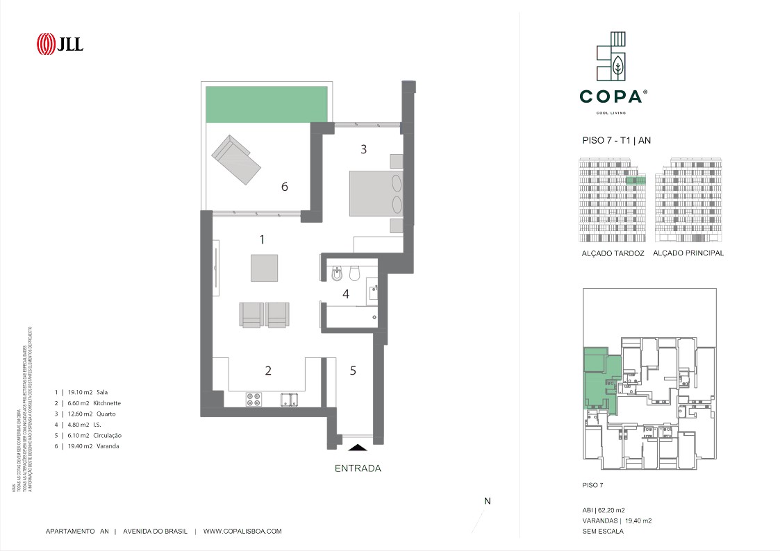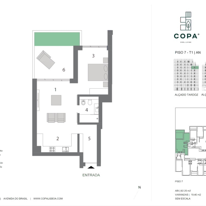 1-bedroom apartment, new, 62 sqm (gross floor area) and 1 parking space, with balcony of 19 sqm, in Lisbon.Alvalade, one of Lisbon’s trendiest neighbourhoods is the location of COPA Cool Living, a nine-storey building divided into 49 units of 1 to 3-bedroom apartments. All the apartments have a special relationship with the exterior, creating a feeling of space without walls, the daily living experience offered by a close-knit neighbourhood. Most of the apartments have access to a balcony, and those on the last floor benefit from private outdoor terraces with swimming pool and dining area.COPA Cool Living offers the most diverse amenities to its residents, from an electric bike park, parking and storage room to a gym and, of course, a shared outdoor garden. This is a new construction project, imbued with symbiosis between sustainability and comfort, ideal for those seeking a fuller life in the city centre. Located on one of the main avenues of the Alvalade neighbourhood, COPA Cool Living is just around the corner from the University Campus, Campo Grande garden, Alvalade Stadium and several iconic sites of the city of Lisbon. So, it is served by an accessible transport network, from the Metro and Carris buses to the modern electric bikes that will take you all over the city. Only five minutes driving distance from Lisbon Airport. This project is for everyone seeking the experience of living in the heart of Lisbon and use of the city parks as their own garden.