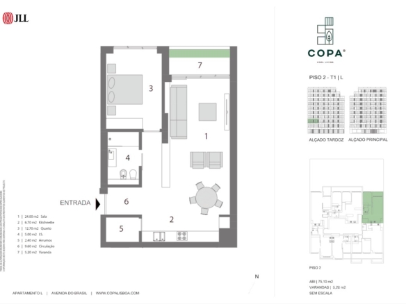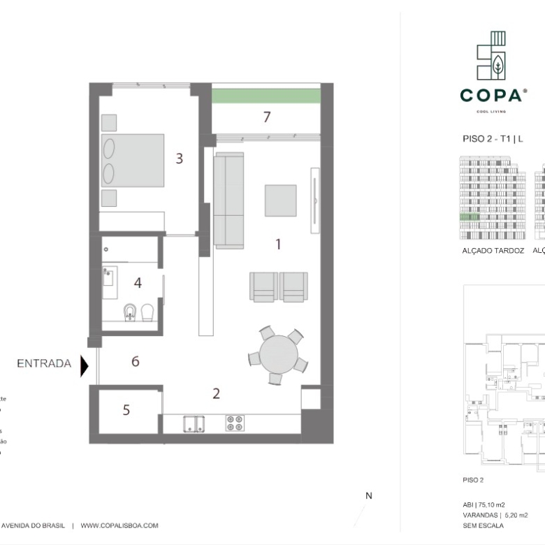 1-bedroom apartment, new, 75 sqm (gross floor area) and 1 parking space, with balcony of 5 sqm, in Lisbon.Alvalade, one of Lisbon’s trendiest neighbourhoods is the location of COPA Cool Living, a nine-storey building divided into 49 units of 1 to 3-bedroom apartments. All the apartments have a special relationship with the exterior, creating a feeling of space without walls, the daily living experience offered by a close-knit neighbourhood. Most of the apartments have access to a balcony, and those on the last floor benefit from private outdoor terraces with swimming pool and dining area.COPA Cool Living offers the most diverse amenities to its residents, from an electric bike park, parking and storage room to a gym and, of course, a shared outdoor garden. This is a new construction project, imbued with symbiosis between sustainability and comfort, ideal for those seeking a fuller life in the city centre. Located on one of the main avenues of the Alvalade neighbourhood, COPA Cool Living is just around the corner from the University Campus, Campo Grande garden, Alvalade Stadium and several iconic sites of the city of Lisbon. So, it is served by an accessible transport network, from the Metro and Carris buses to the modern electric bikes that will take you all over the city. Only five minutes driving distance from Lisbon Airport. This project is for everyone seeking the experience of living in the heart of Lisbon and use of the city parks as their own garden.
