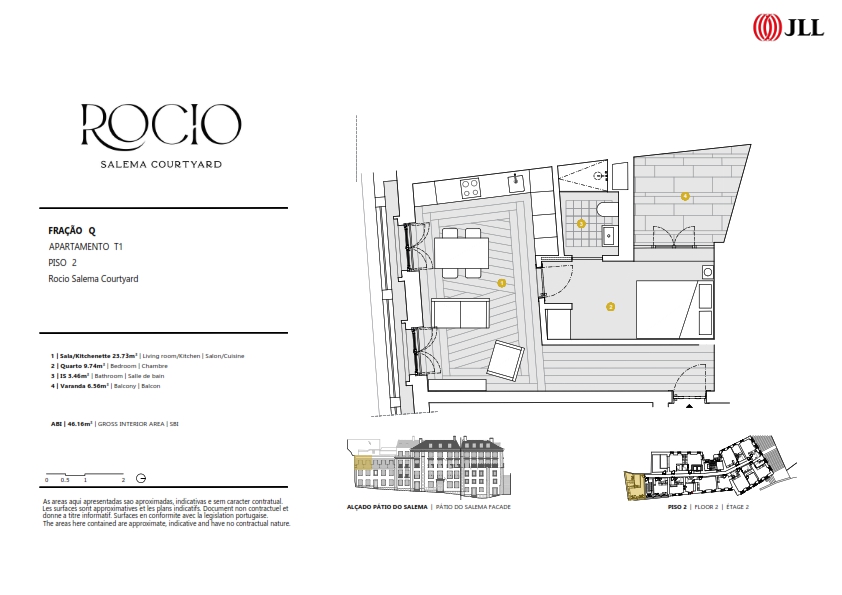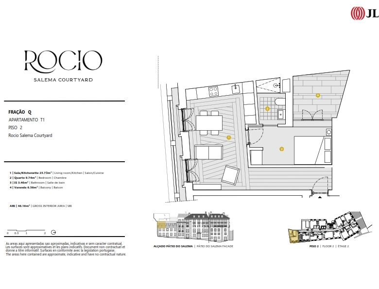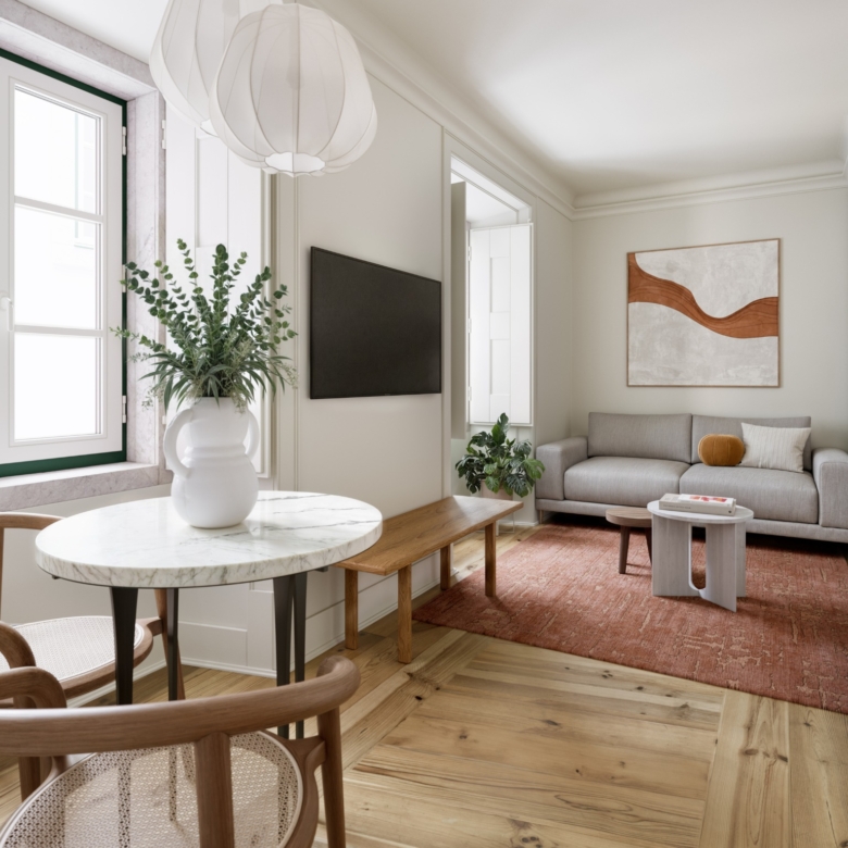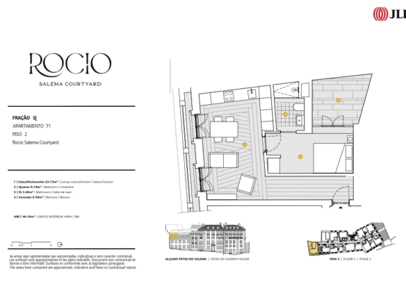 1 Bedroom apartment, new, with 46 sqm (gross floor area) and a balcony, at the Rocio Salema Courtyard project, in Praça do Rossio, Lisbon. The Rocio – Salema Courtyard, a building comprising 36 studio, 1-bedroom, 1-bedroom duplex and 2-bedroom duplex apartments, is located next to one of the most iconic squares in Lisbon, Praça do Rossio.This corner of Lisbon that marvels people from all over the world represents in a perfect manner the intersection between heritage and modernity, which results in a picturesque and welcoming space in the centre of the hustle and bustle of the city. Despite being a rehabilitated building, the Rocio – Salema Courtyard has kept its typical Lisbon structure and the original three storeys, overlooking the river. The Rocio is the ideal address for those wanting to live or invest in one of the most vibrant cities due to the constant tourism growth. The development is near important monuments of the metropolis, such as the statue of D. Pedro IV, the Teatro D. Maria II and the Coliseu dos Recreios. Next to Praça do Rossio, the building has a privileged location in terms of transport, at a short distance from the underground, bus and the Rossio train station. This is the perfect opportunity for those wanting to be where the action is while having a luxurious haven to call home.