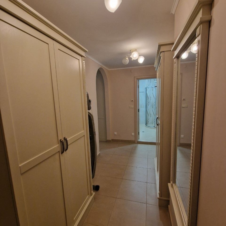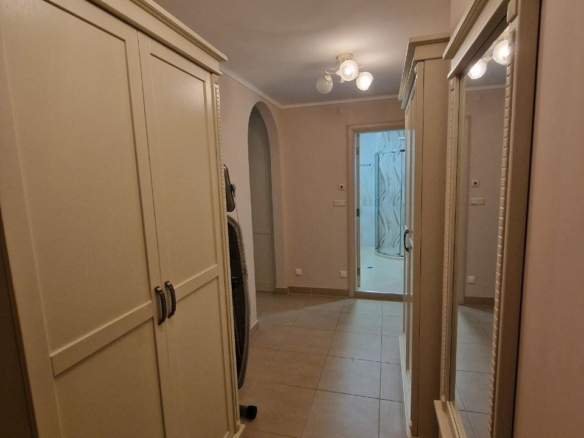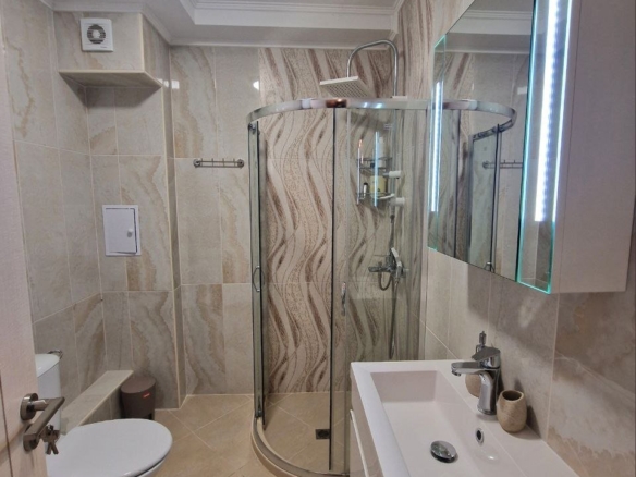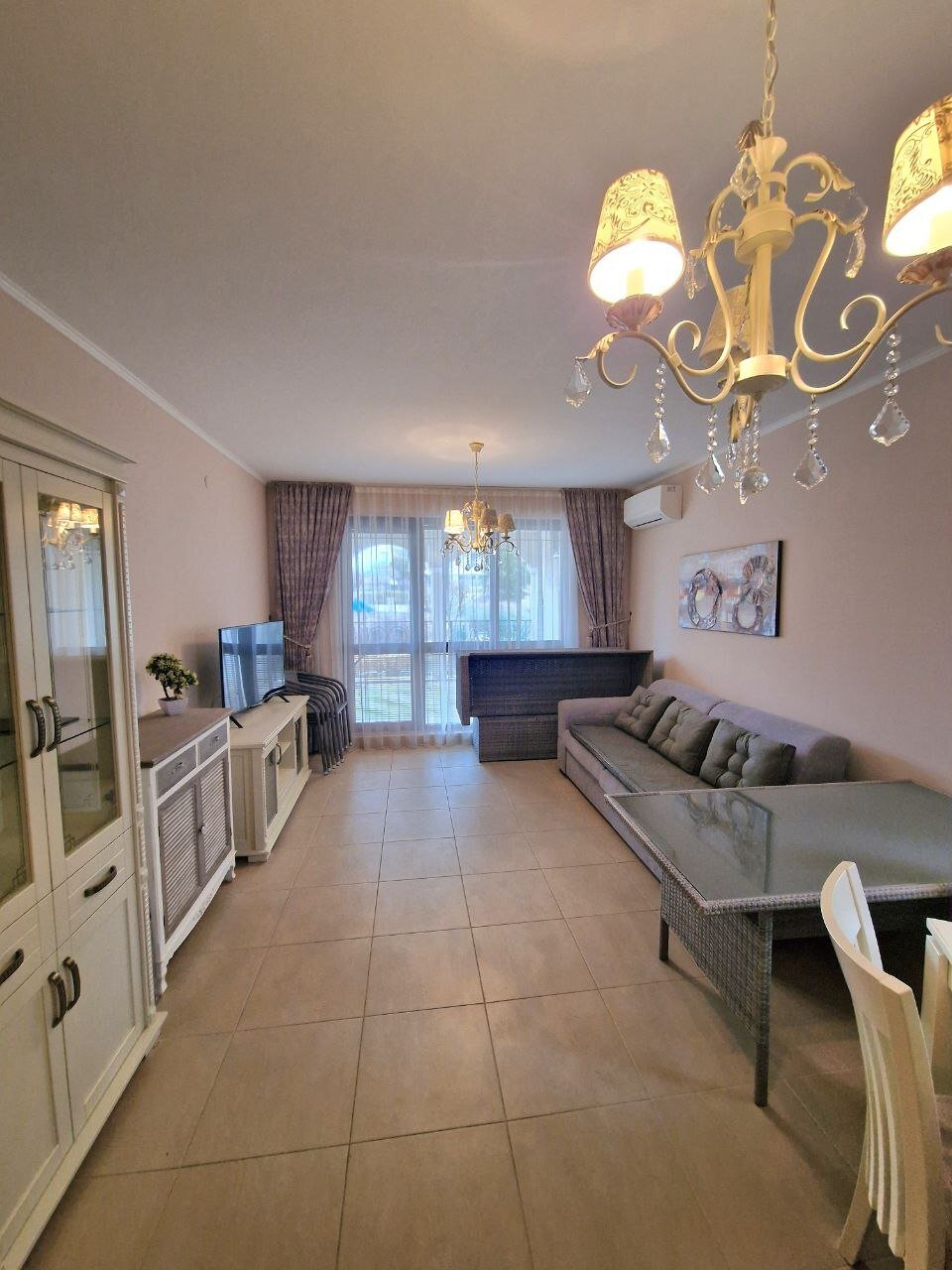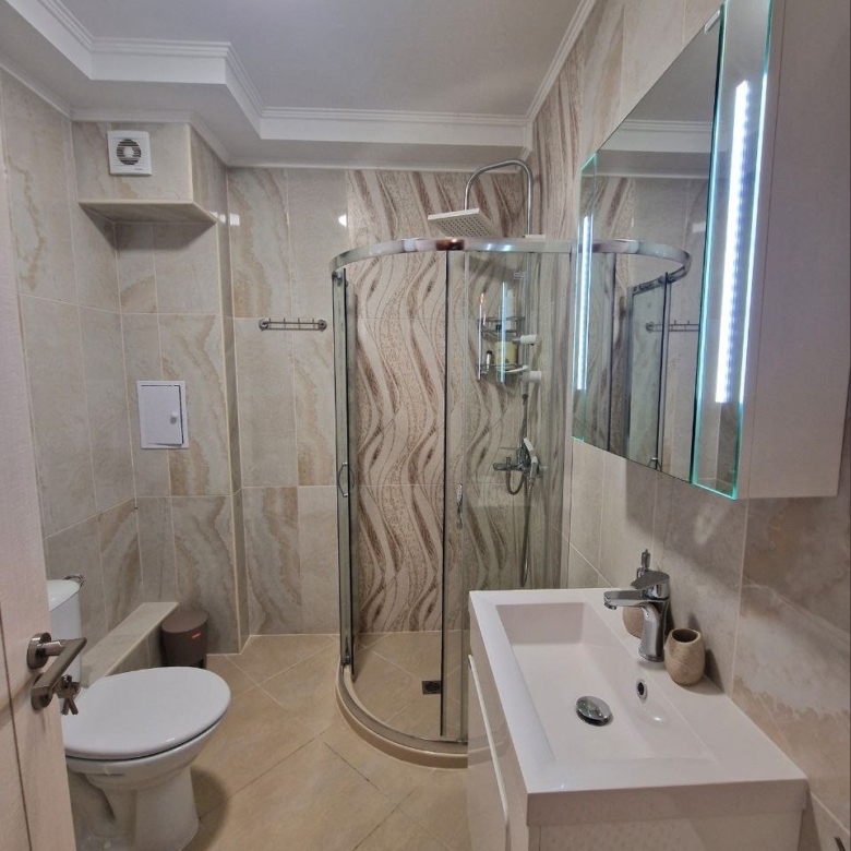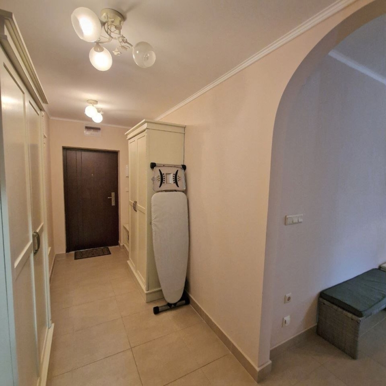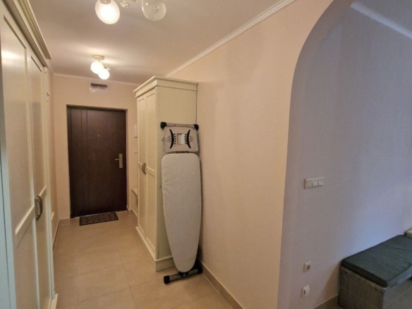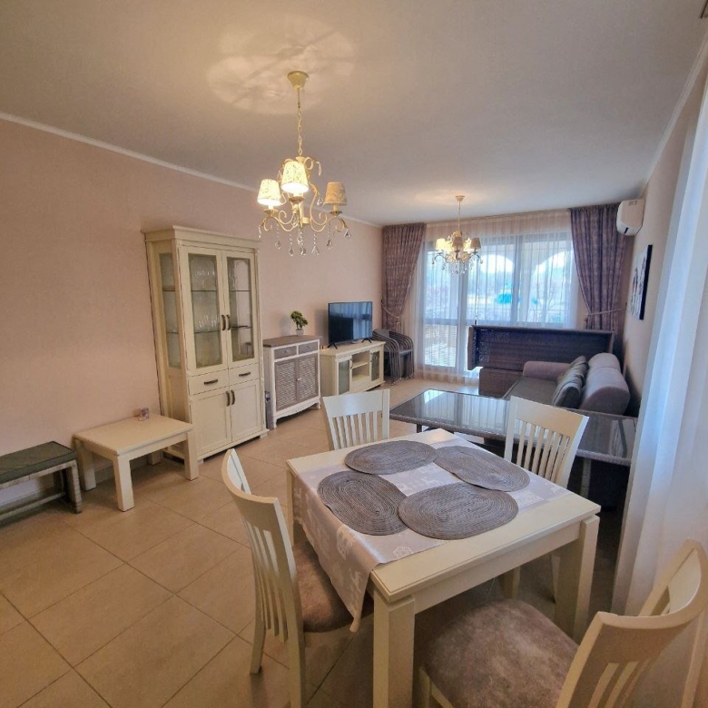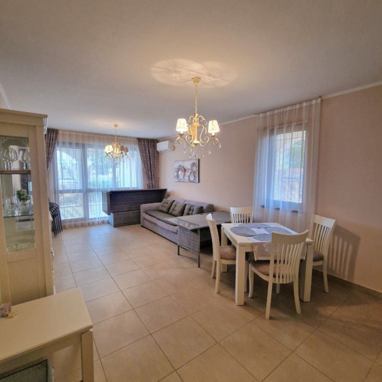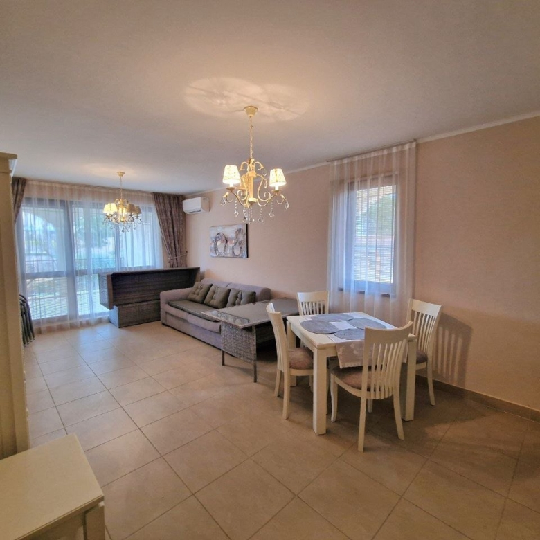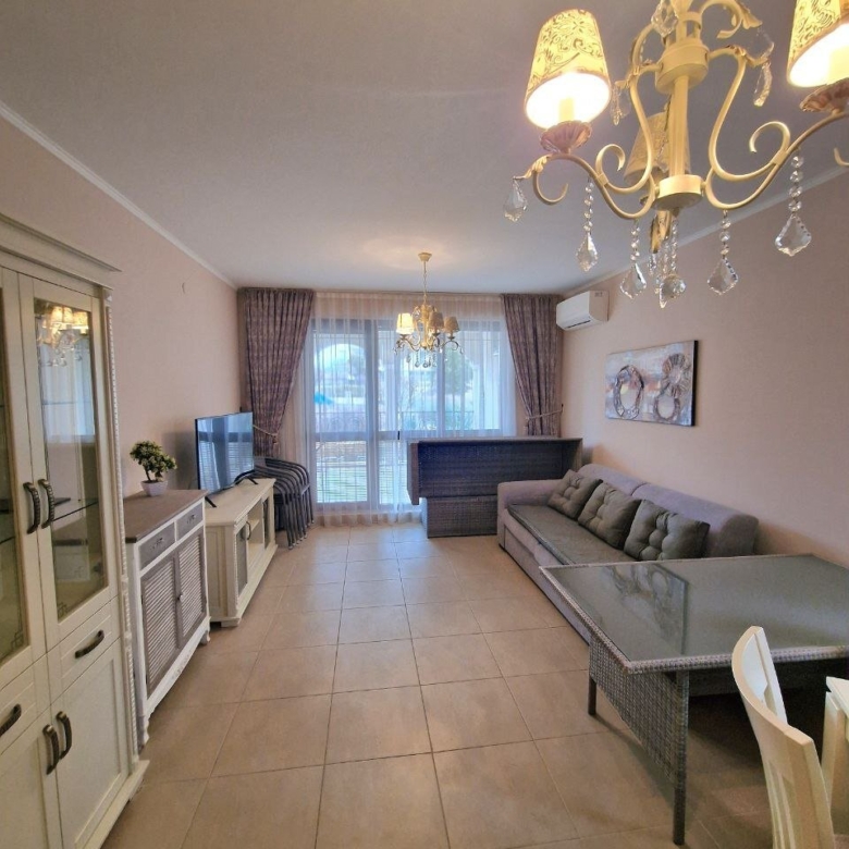 The apartment with a total area of 62.05 m² is located on the ground floor. It consists of a hallway, a living room with a kitchen area, a bathroom, and a large terrace. The apartment is furnished with high-quality furniture and all necessary appliances. It offers a view of the complex’s grounds.