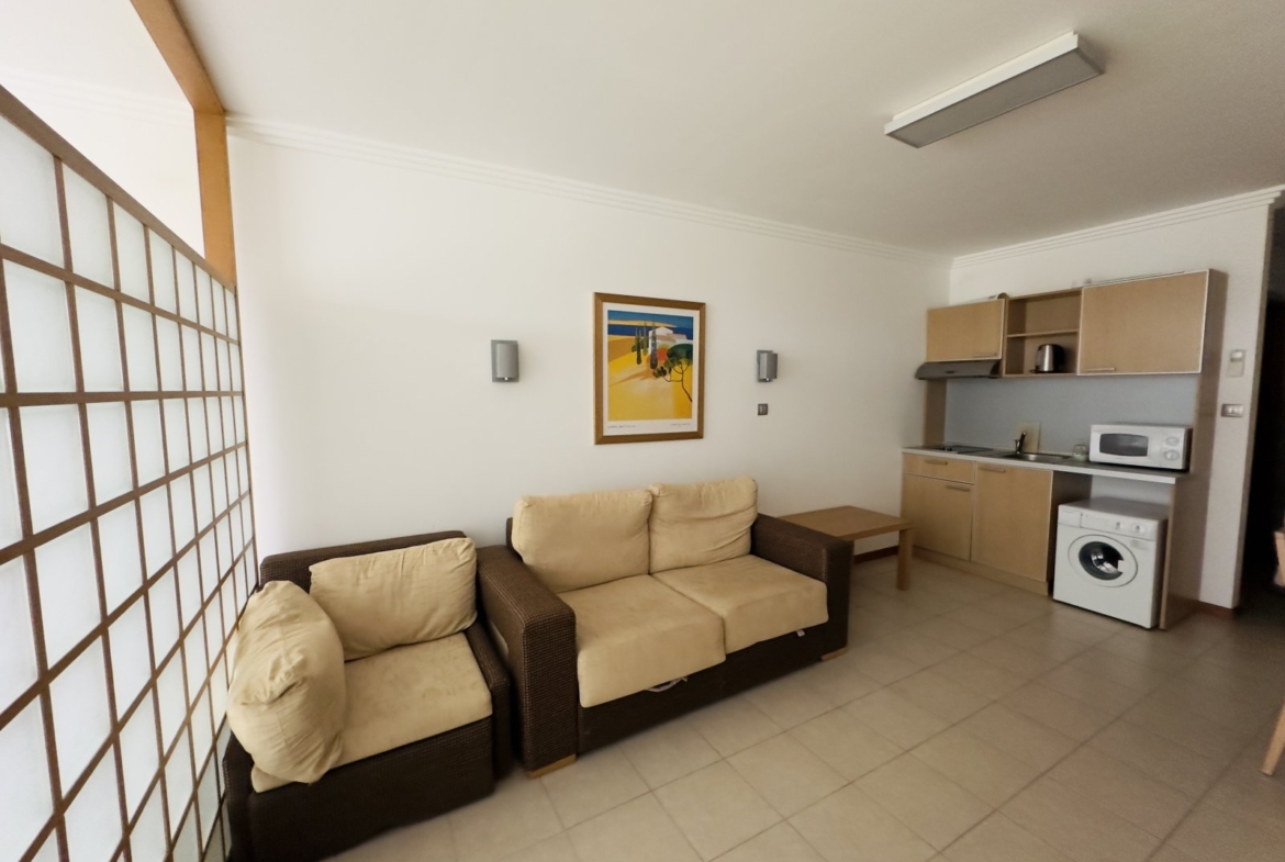 For sale is a comfortable studio apartment with a living area of 60.4 m², located on the 4th floor of the exclusive five-star complex Emerald Beach Resort & Spa in Ravda, just a few minutes’ walk from the beach. The studio features a bright living and sleeping area with a kitchenette, a bathroom, and a balcony overlooking the well-maintained greenery of the resort.