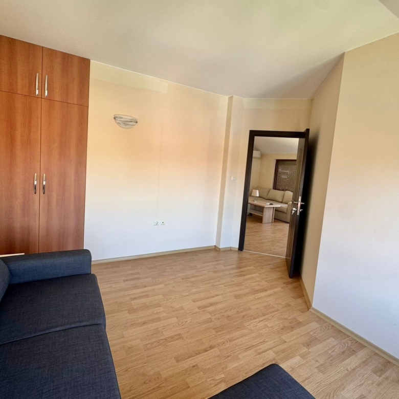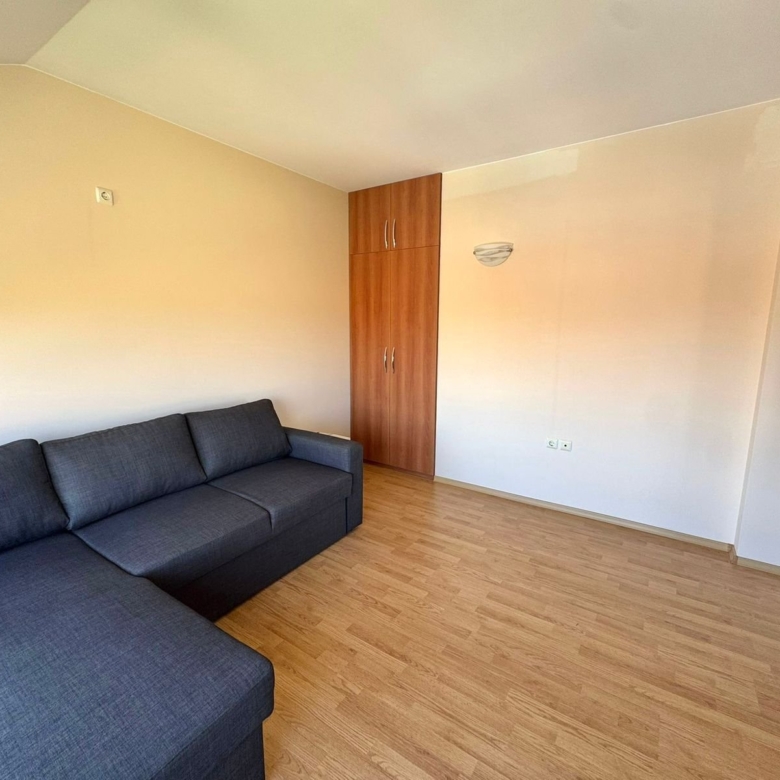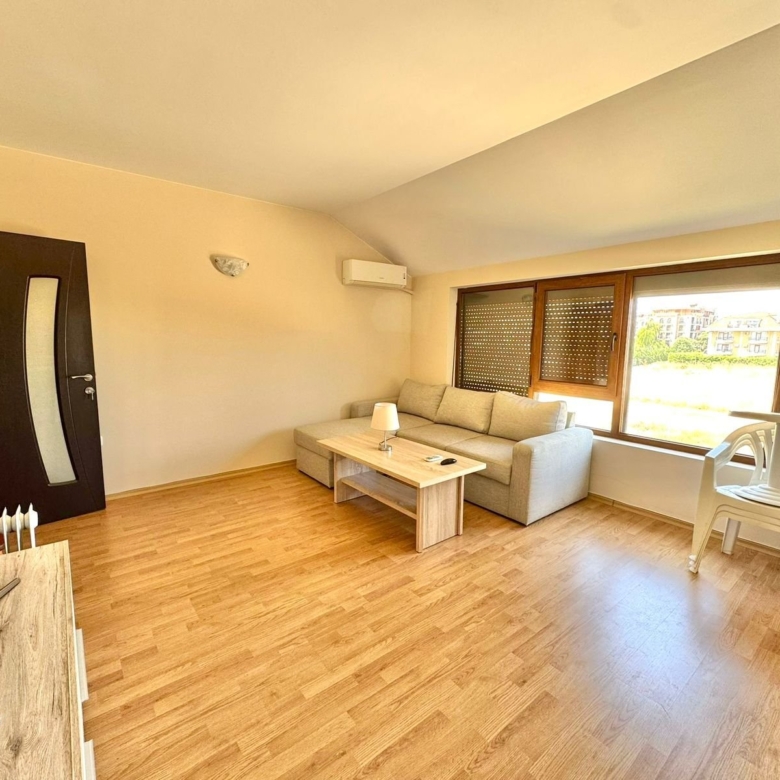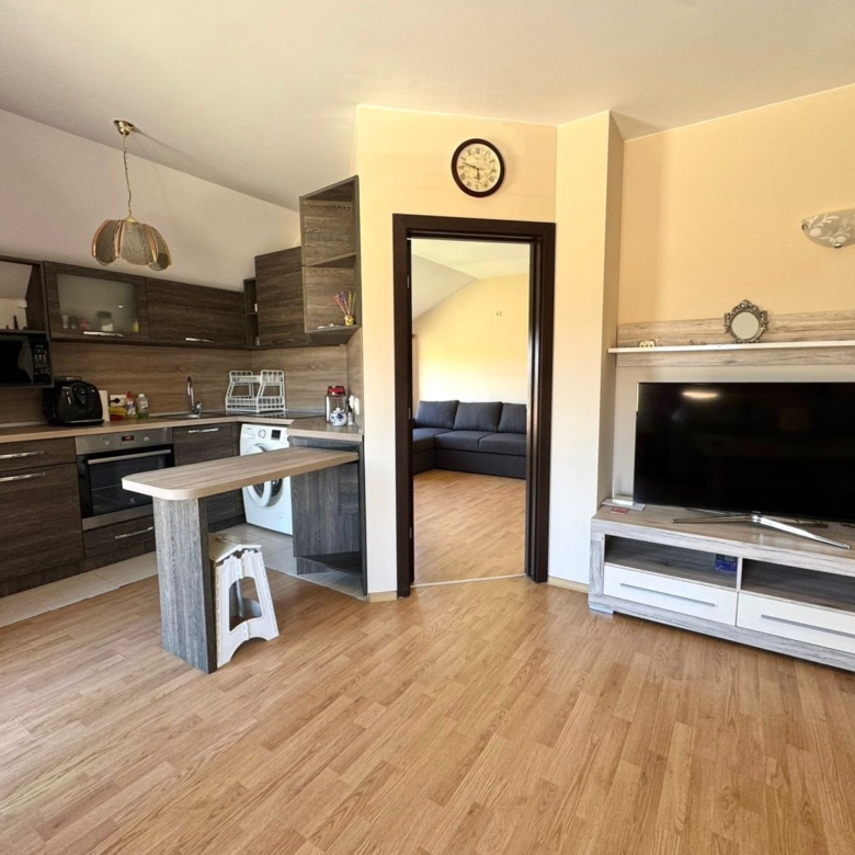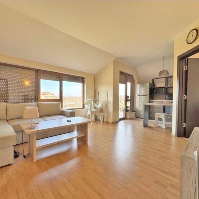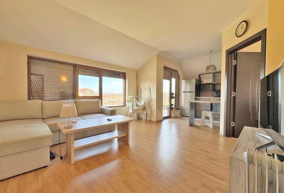 Two-room apartment in the modern Elitonia 2 complex in Ravda. The apartment is located on the 4th floor and has a living area of 59 m². It consists of a living room with a kitchen area, a separate bedroom, a bathroom, and a balcony overlooking the surrounding fields.