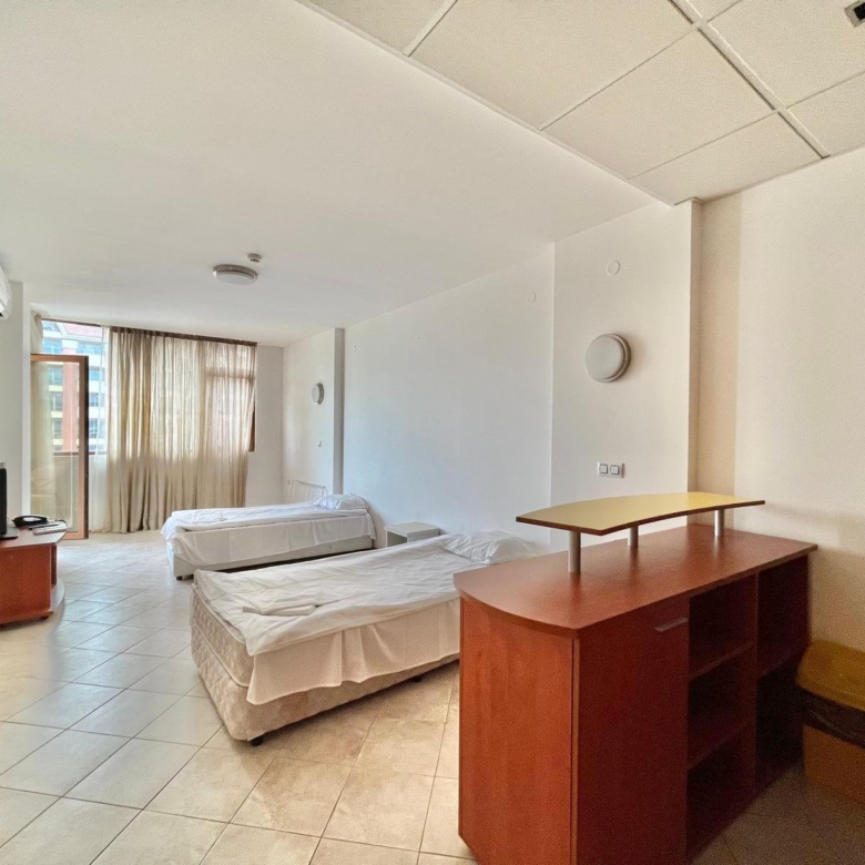 The “Poseidon” complex in Sunny Beach is one of the more elegant residential developments on the Bulgarian Black Sea coast. The architecture is modern and Mediterranean-inspired, featuring well-maintained communal areas, pools, security service, reception, and optional parking.