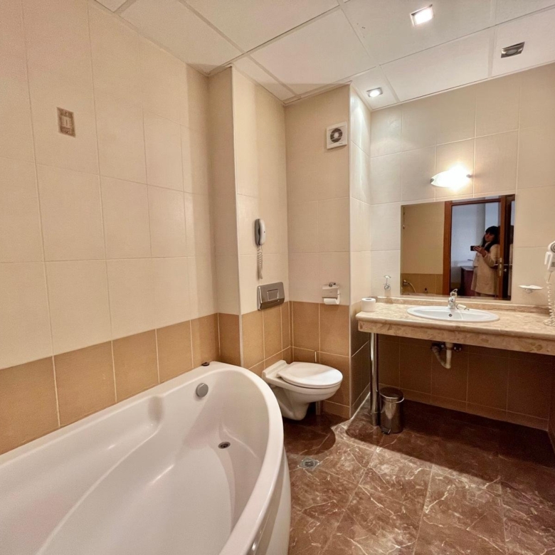 The entire apartment is tiled and has air conditioning in both the living area and the bedroom. The small kitchen is functional, and the living area includes a TV and two single beds. The balcony offers a beautiful view of the surrounding facilities. The bedroom is equipped with two additional single beds. The bathroom features a bathtub.