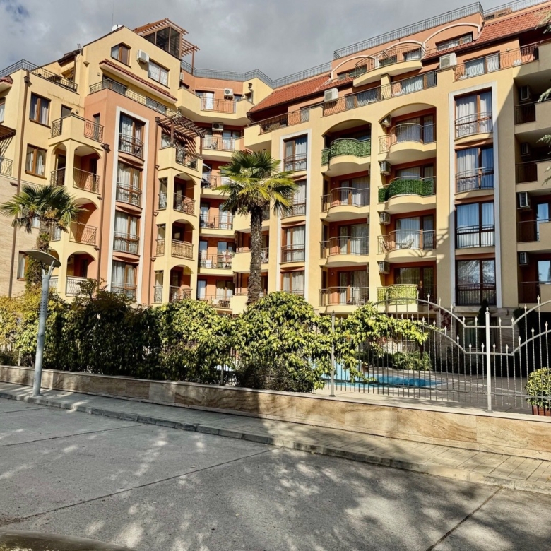 We offer for sale a 2-room apartment with a view of the pool. The apartment is located on the fifth floor and has a total area of 52 sqm. It consists of an entrance hall, a living room with a kitchenette and dining area, a bedroom, a bathroom with toilet, and a balcony. It is being sold fully furnished and equipped. The living room has an installed air conditioner. The balcony is furnished with garden furniture – perfect for enjoying the charm of spring and summer.