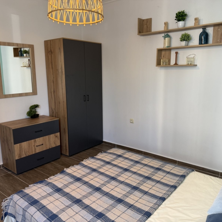 Bedroom with double bed, wardrobe, chest of drawers, air conditioning, decor, and shelves