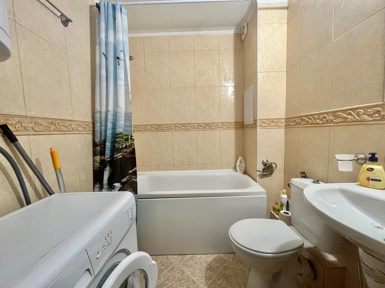 The bathroom is equipped with a bathtub and a washing machine.