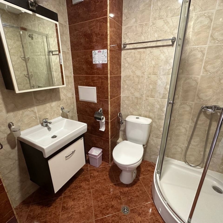 This stunning 2-room apartment features a stylish living room with orange accent elements, a cozy sitting area, and an air-conditioned dining space. The spacious corner kitchen is fully equipped with an oven, washing machine, fridge, and microwave — ideal for maximum comfort. The bathroom includes a modern shower cabin, while the bedroom boasts a large wardrobe. A highlight of this apartment is the expansive balcony, offering breathtaking sea views — perfect for enjoying peaceful moments. This apartment combines elegance, functionality, and a fantastic seaside location!