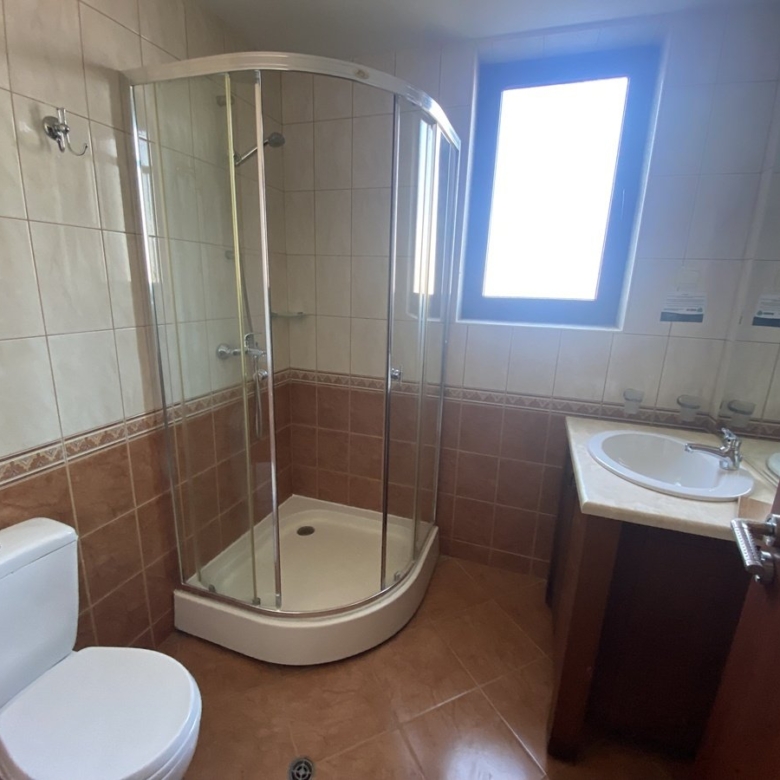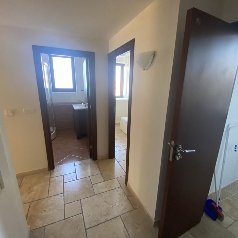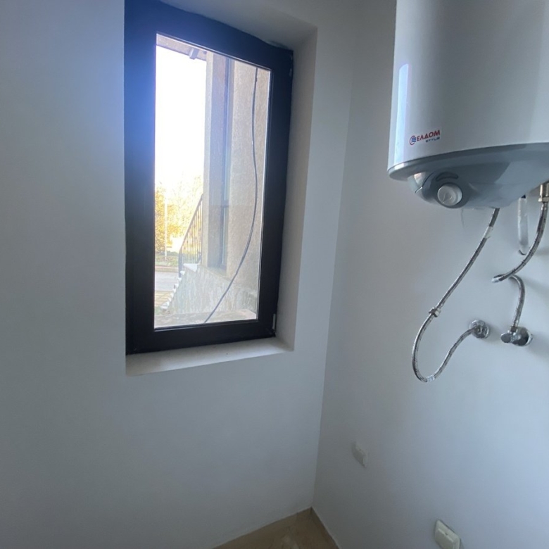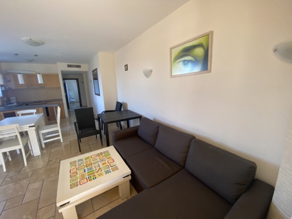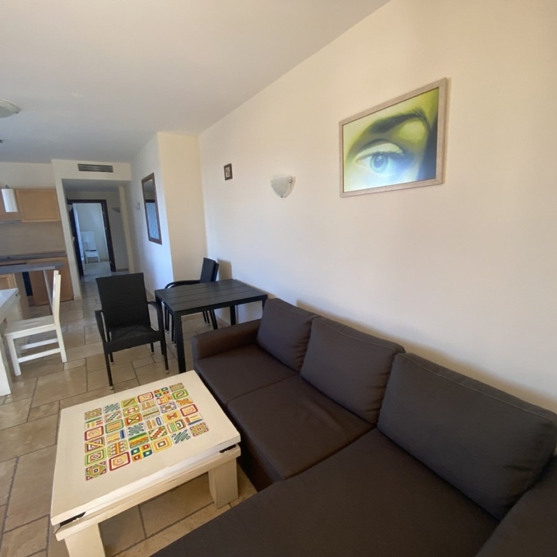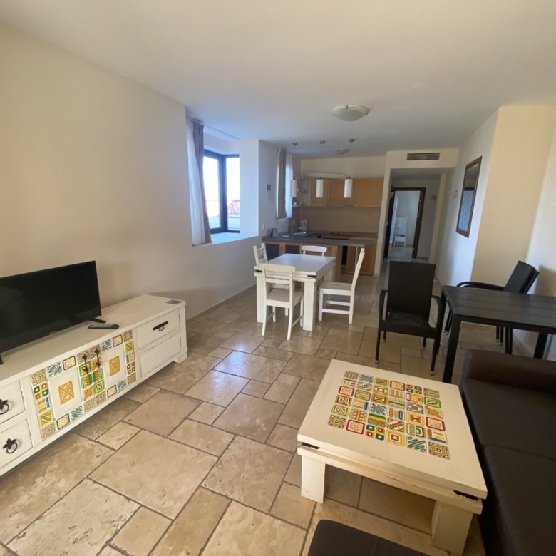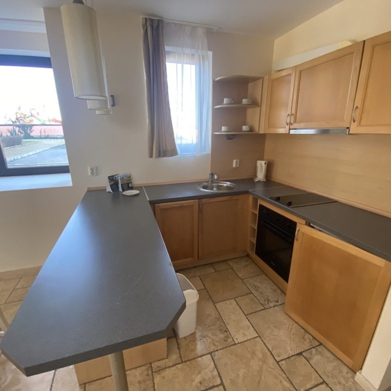 We present to you a 2-room apartment in the Kaliakria Resort complex, Topola region, Dobrich, Bulgaria. The living room features a couch, coffee table, decorations, air conditioning, lamps, TV, cabinets, dining table, chairs, and curtains. The integrated kitchen includes an oven, ceramic cooktop, extractor hood, and refrigerator. The bedroom is equipped with a double bed, wardrobe, lamps, and curtains. You have access to the terrace with a view of the pool from both the living room and bedroom. The bathroom is designed as a shower room.