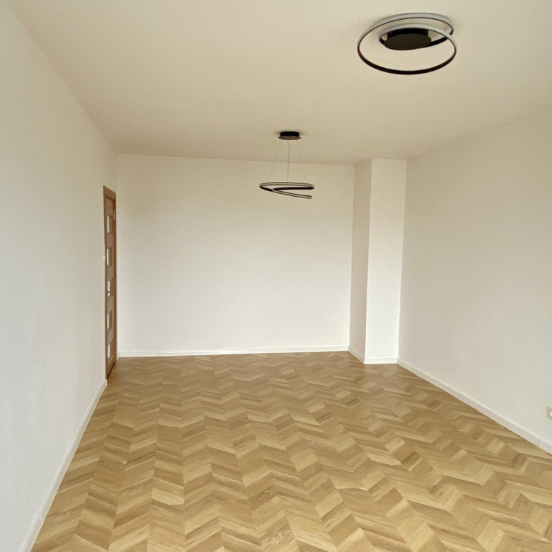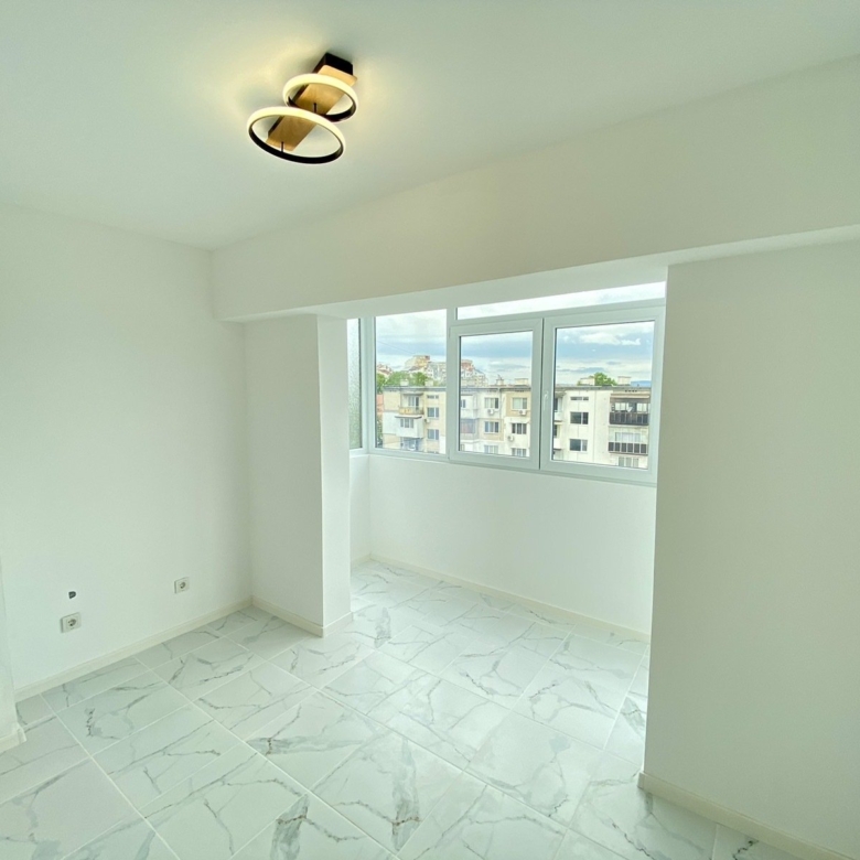 Two-room apartment in the Troshevo district, very close to Dobri Chintulov Primary School. The apartment is located on the 6th floor of a total of 8 in a well-maintained building with controlled access. The apartment faces east and west, has a built-up area of 60.59 m² and features the following layout: large living room of 24 m², bedroom of 13 m², kitchen of 10 m², L-shaped hallway, shared bathroom, and cellar. The living room has a private terrace. The apartment has been fully renovated and is offered as move-in ready.