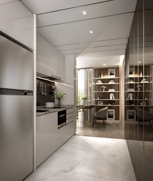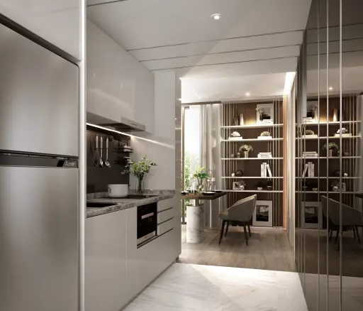 Step Inside a Light-Filled, Contemporary Bangkok CondoThis 2-bedroom, 1-bath condo on Sukhumvit Soi 10 feels really open and fresh thanks to those floor-to-ceiling curved windows. You’ll get plenty of natural light throughout the day, and the urban cityscape views make it a nice spot to just relax and watch the city buzz below.The layout is smart and practical — the open-plan living and dining areas flow together smoothly, so you’ll probably spend most of your time here. The contemporary minimalist design keeps things feeling calm, with neutral colors, light wood floors, and recessed ceiling lights that create a soft, welcoming atmosphere.The kitchen is modern and efficient, featuring sleek white cabinets, a built-in oven and stovetop, stainless steel fridge, and thoughtful touches like under-cabinet lighting and a marble-effect countertop. There’s even a handy wall-mounted utensil rack to keep everything organized.Storage is well integrated with built-in shelving in the living area, perfect for books, decorative pieces, or whatever you want to display. The comfortable daybed and sculptural glass coffee table add personality without overcrowding the space. Overall, it’s a stylish yet practical home that’s ready to move into without needing any work.