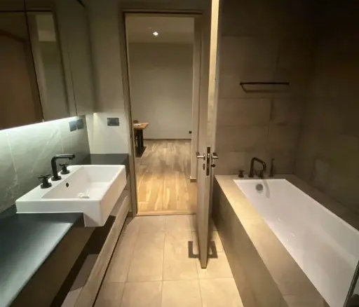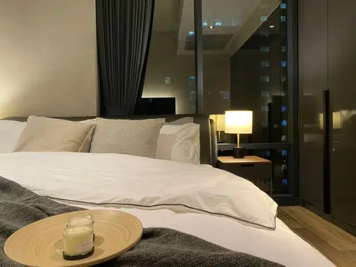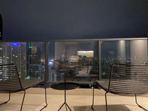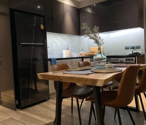 A relaxed, modern space with great city vibesThis two-bedroom, one-bath condo sits pretty high up on the 26th floor, so you get these amazing panoramic views of Bangkok’s city lights—especially impressive at dusk. The layout’s open-concept, so your living and dining areas flow nicely together. You’ll probably spend most of your time here, kicking back on the tan leather sofa with some cushions and throws, or dining around a beautiful wooden table that has this unique live-edge design, paired with comfy brown leather chairs. The floor lamp nearby adds soft, warm lighting that makes the space feel cozy in the evenings.Wood plank flooring runs throughout, giving a warm, natural touch, and neutral wall colors keep everything feeling calm and modern. The kitchen’s sleek and practical, with black glossy upper cabinets and wood lower ones, a built-in electric stove, and neat under-cabinet lighting that brightens the stone-textured backsplash. It’s compact but thoughtfully designed for everyday cooking.The bedroom’s a real highlight—big windows with blackout curtains, a comfy double bed dressed in crisp white linens, and warm ambient lighting from bedside lamps. Storage’s generous with a dark, sleek wardrobe, and the bathroom feels quite luxe with both a bathtub and a separate rain shower, modern fixtures, and natural beige tiles.Out on the balcony, you’ve got a small set-up with wireframe chairs and a table—perfect for a quiet morning coffee or winding down while watching the city buzz below. Overall, it’s a great blend of modern comfort and city energy in one, freehold condo.