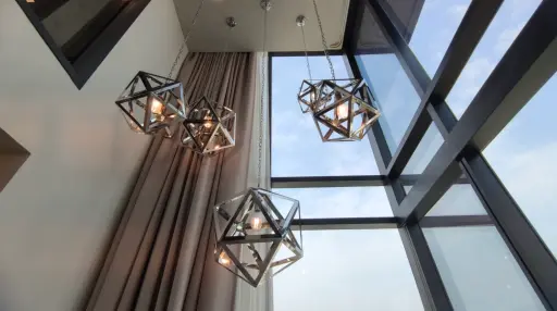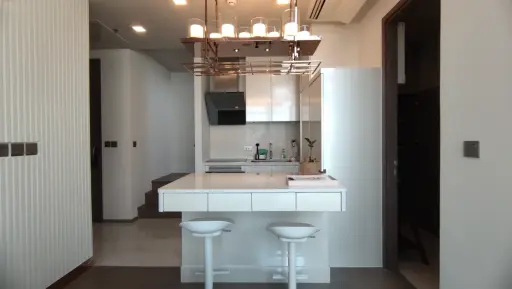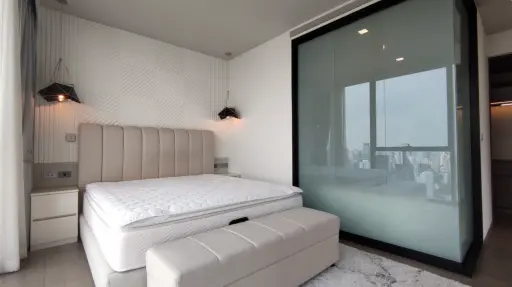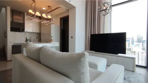 Spacious 2-Bedroom Condo with Panoramic ViewsThis unit on the 39th floor really stands out if you’re looking for a bright, airy space. The open-concept layout combines the living area and kitchen seamlessly, so you’ll probably spend most of your time here. Floor-to-ceiling windows flood the room with natural light and open up to a balcony with glass railings, giving you unobstructed views of Bangkok’s skyline.Living and Kitchen AreasThe living room feels comfy with its neutral tones and a sectional sofa that’s perfect for relaxing or entertaining. There’s a wall-mounted flat screen TV and light-colored curtains that you can draw for privacy or to control the light. The kitchen, right next to the living area, has a modern minimalist vibe with glossy white countertops and built-in appliances. The large island doubles as a breakfast bar, complete with two bar stools—good for quick meals or chatting while you cook.Bedrooms and BathroomsThe master bedroom is inviting with a large padded headboard, nightstands, and an ottoman bench at the foot of the bed. You’ll find a glass partition separating the bedroom from the bathroom, adding a contemporary touch while keeping things light and open. The bathroom includes a freestanding bathtub—nice for unwinding after a long day. The wardrobe features frosted glass with a black frame, tying into the condo’s sleek, modern style.Overall, it’s a well-thought-out space with high ceilings and quality finishes, perfect for anyone wanting a stylish, comfortable home with fantastic views right in the heart of Watthana.
