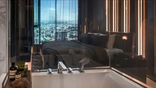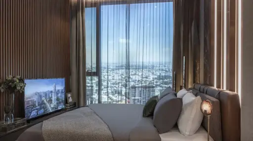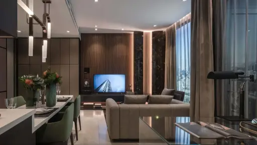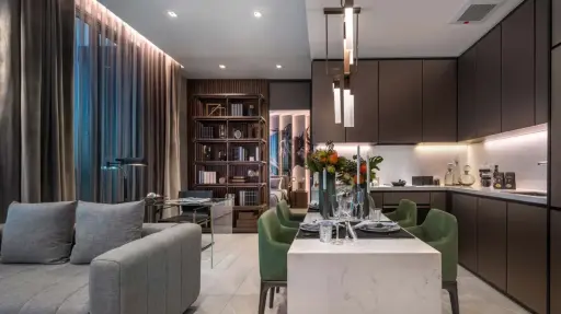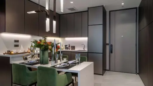 Feel right at home in this thoughtfully designed 2-bedroom condo in Khlong Tan Nuea.The open-plan layout really makes the most of the 72 sqm space, with the living room, dining area, and kitchen flowing seamlessly together. Large floor-to-ceiling windows bring in lots of natural light and give you a great cityscape view, perfect for relaxing evenings or entertaining friends.The living area is comfortably furnished with a gray upholstered sofa and armchair, anchored by a soft area rug that adds warmth to the neutral-toned tile floor. The dining space is genuinely inviting, featuring a marble table set with six green upholstered chairs and contemporary pendant lighting that adds a bit of style without feeling over the top.In the kitchen, you’ll appreciate the modern touches like under-cabinet lighting, white countertops, and dark cabinetry, plus integrated appliances that keep everything sleek and uncluttered. Storage’s handled nicely with built-in shelves filled with books and decorative pieces, and there’s even a secure entry door near the kitchen, which adds a practical touch.Both bedrooms come with their own bathrooms, so privacy isn’t an issue, and the overall minimalist design with clean lines and subtle wood paneling with illuminated black marble accents keeps the space feeling contemporary and polished.