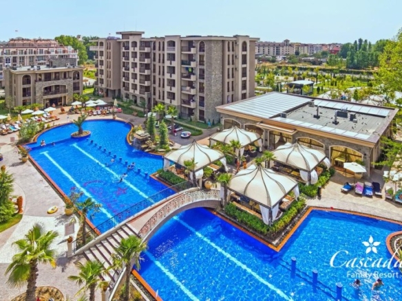 We offer for sale a two-bedroom apartment in complex “Cascadas”, Sunny Beach, Bulgaria! The apartment has a total area of 70 sq.m. is located on the 5th floor in the quiet part of the complex and consists of: an entrance hall, a living room with a kitchen and a dining area, two bedrooms, a bathroom with a shower and a terrace. The apartment is offered fully furnished and equipped, with nice bathroom and tiled floors throughout and air-condition. Maintenance fee – 17 €/sq.m. in year. Complex “Cascadas” is a housing of an high level of comfort in the developed part of the resort “Sunny Beach”, located on an area of ??more than 90,000 sq.m. among the green park. Infrastructure of the complex: – 9 swimming pools with childrens sections; – the first in Sunny Beach 50-meter Olympic-sized swimming pool, which introduced a water filtration system without the use of chemicals. – a small park with an area of ??about 6000 sq.m; – 3 artificial lakes with beautifully landscaped lawns around; – 4 external jacuzzis (free of charge); – 4 outdoor showers near the pools (free of charge); – 2 mini water parks for your children; – 2 indoor and 1 outdoor fitness centers (free of charge); – volleyball court on the sand (free of charge); – 3 bars near the pools; – 3 restaurants with indoor and outdoor seating; – 2 barbecue areas (free of charge); – beauty saloon; – supermarket; – 3 spa centers; – 3 saunas; – 4 playgrounds; – childrens room for games with a nanny; – WI-FI Internet throughout the territory (free of charge); – underground parking; – parking places; – reception; – round the clock security; – Eco Park with a petting zoo, horses, an amphitheater, swings, rabbits and more. others