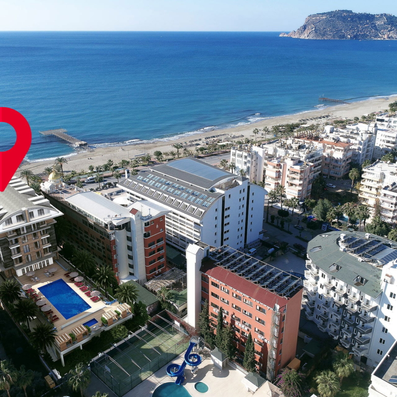 Located just 700 meters from Cleopatra Beach and 900 meters from the central bazaar, the site enjoys both sea and castle views from elevated floors.