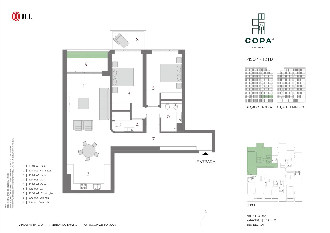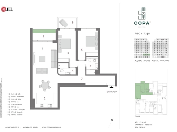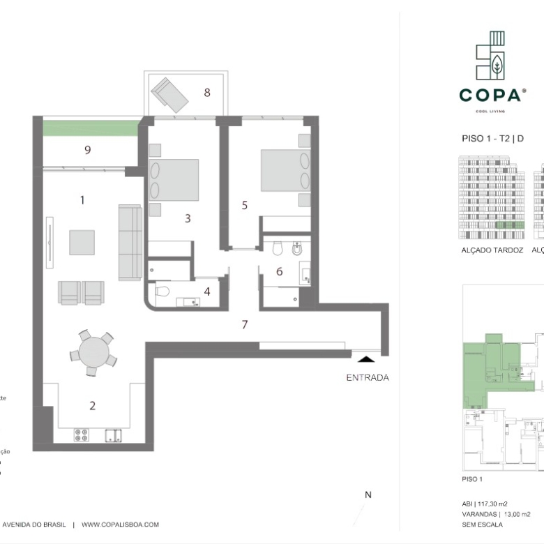 2-bedroom apartment, new, 117 sqm (gross floor area) and 1 parking space, with balcony of 13 sqm, in Lisbon.Alvalade, one of Lisbon’s trendiest neighbourhoods is the location of COPA Cool Living, a nine-storey building divided into 49 units of 1 to 3-bedroom apartments. All the apartments have a special relationship with the exterior, creating a feeling of space without walls, the daily living experience offered by a close-knit neighbourhood. Most of the apartments have access to a balcony, and those on the last floor benefit from private outdoor terraces with swimming pool and dining area.COPA Cool Living offers the most diverse amenities to its residents, from an electric bike park, parking and storage room to a gym and, of course, a shared outdoor garden. This is a new construction project, imbued with symbiosis between sustainability and comfort, ideal for those seeking a fuller life in the city centre. Located on one of the main avenues of the Alvalade neighbourhood, COPA Cool Living is just around the corner from the University Campus, Campo Grande garden, Alvalade Stadium and several iconic sites of the city of Lisbon. So, it is served by an accessible transport network, from the Metro and Carris buses to the modern electric bikes that will take you all over the city. Only five minutes driving distance from Lisbon Airport. This project is for everyone seeking the experience of living in the heart of Lisbon and use of the city parks as their own garden.