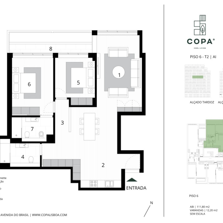 2-bedroom apartment, new, 112 sqm (gross floor area) and 1 parking space, with balcony of 12 sqm, in Lisbon.Alvalade, one of Lisbon’s trendiest neighbourhoods is the location of COPA Cool Living, a nine-storey building divided into 49 units of 1 to 3-bedroom apartments. All the apartments have a special relationship with the exterior, creating a feeling of space without walls, the daily living experience offered by a close-knit neighbourhood. Most of the apartments have access to a balcony, and those on the last floor benefit from private outdoor terraces with swimming pool and dining area.COPA Cool Living offers the most diverse amenities to its residents, from an electric bike park, parking and storage room to a gym and, of course, a shared outdoor garden. This is a new construction project, imbued with symbiosis between sustainability and comfort, ideal for those seeking a fuller life in the city centre. Located on one of the main avenues of the Alvalade neighbourhood, COPA Cool Living is just around the corner from the University Campus, Campo Grande garden, Alvalade Stadium and several iconic sites of the city of Lisbon. So, it is served by an accessible transport network, from the Metro and Carris buses to the modern electric bikes that will take you all over the city. Only five minutes driving distance from Lisbon Airport. This project is for everyone seeking the experience of living in the heart of Lisbon and use of the city parks as their own garden.