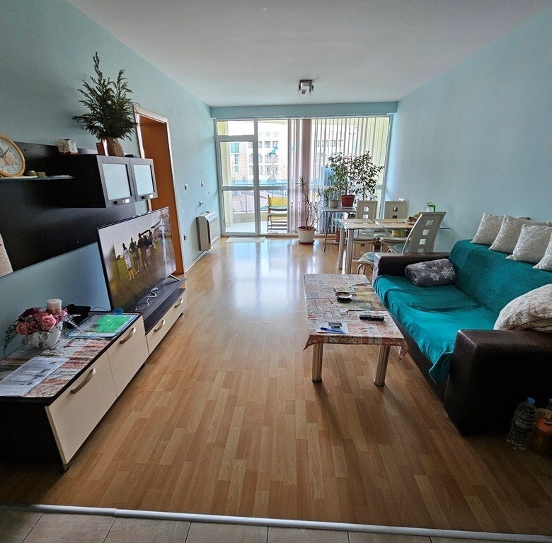 This is a spacious 3-room apartment on the second floor of the Marina Holiday Club in Pomorie, only 200 meters from the beautiful beach. The city center is a 5-minute drive away, Burgas is 15 minutes away, and Sunny Beach is also 15 minutes away.
