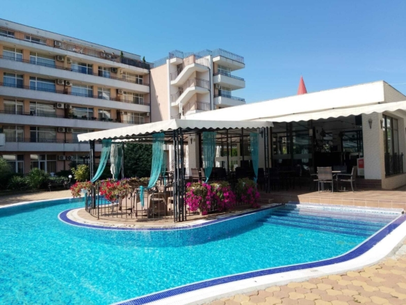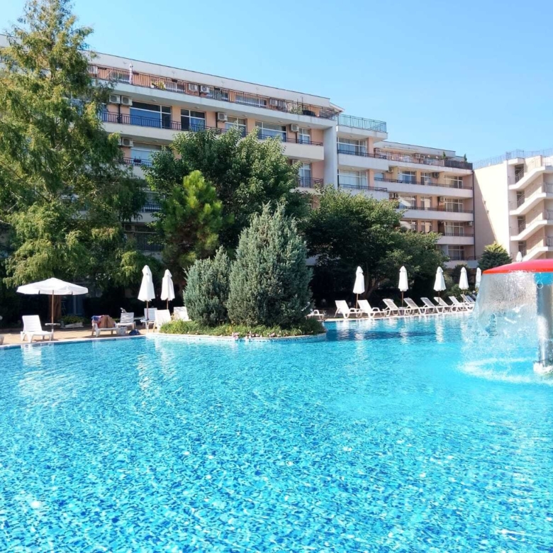 The distance to the beach is 700 meters, just a few minutes’ walk from the bus station, from which buses depart in all directions of Bulgaria. There is a “Molodost” supermarket, pharmacies, vegetable shops, souvenir shops, a beauty salon, and an exchange office 30 meters away. It is only a few minutes’ walk to numerous bistros and restaurants where you can enjoy a very tasty and affordable lunch. The famous entertainment center “Camelot” is located 20 meters from the complex, where you can visit a restaurant, a game room, and go bowling. Sports enthusiasts don’t have to go far, as there is a large fitness room within the building itself.