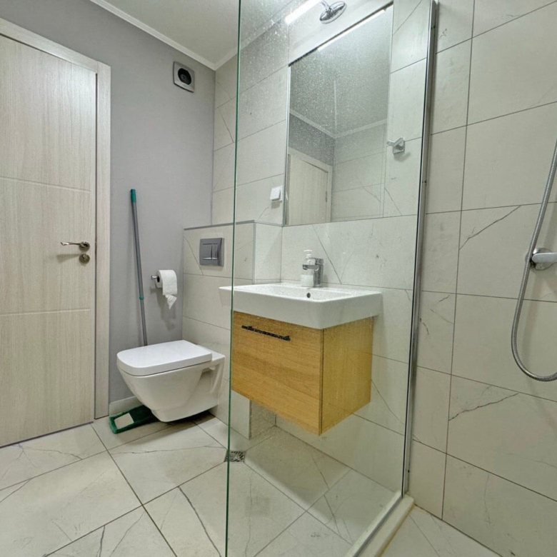 Modern bathroom fittings: The bathrooms feature high-quality fixtures, a shower or bathtub, a toilet, a sink, and large mirrors.