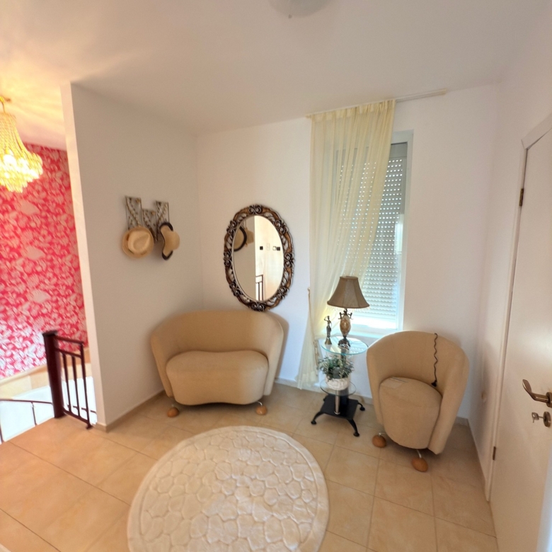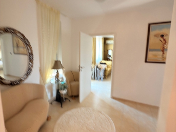 The maisonette features two spacious bedrooms, a large living room, two modern bathrooms, and a bright dining area. Large windows and several balconies let in plenty of light and offer beautiful views of the well-maintained complex or pool area. The living spaces are furnished and equipped to high standards, allowing for immediate move-in.