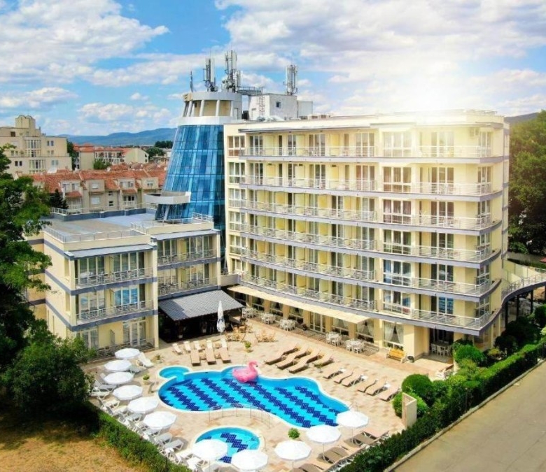 250 m to the beach! 2 BED ground floor apartment, 88 sq.m., in Sol E Mar, Sunny beach! We present 2 bedroom apartment with brand new furniture and appliances in a year-round complex in Sunny Beach. Excellent location in the eastern part of the resort, close to the central beach (200 m), Action Aquapark and Kuban Casino. The apartment is situated on the ground floor and has a total living area of 88 sq.m. It comprises of: – open-plan kitchen with living and dining-room; – 2 bedrooms; – bathroom/WC with washer and dryer; – balcony. The apartment has new modern furniture and is ready to live in! · Suitable for living all-year-round! Excellent location – close to year-round shops, restaurants, beach! Act 16 and separate accounts for electricity and water. The building was a functioning hotel and has been through complete renovation. Specifications: thermal insulation (styrofoam) 5 cm; * PVC joinery double glazing; * air conditioners – CROWN; – common parts – latex, terracotta. Facilities on the territory: outdoor swimming pool; – restaurant; – a bar; – garden; – parking. Annual maintenance fee – 10 EUR/sq.m.