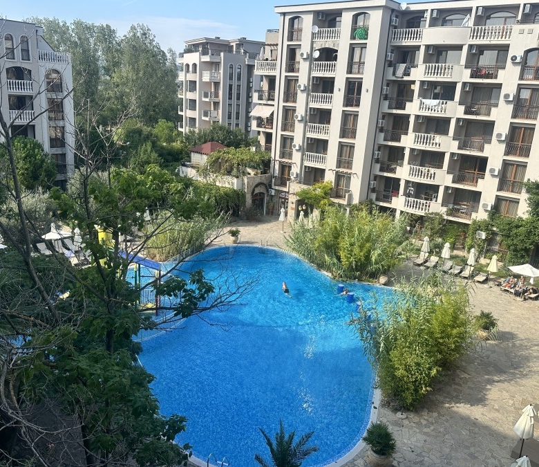 3 BED pool view apartment, 93 sq.m., in Cascadas Family Resort, Sunny beach Beautifully furnished 3 bedroom apartment for sale in an elite residential complex Cascadas Family Resort in the center of Sunny Beach, 500 meters from the central beach The total area is 93 sq. m. 5th floor, with pool views The apartment is for sale with furniture and appliances as shown on the photos. There is equipped kitchen (fridge, microwave, oven, ceramic hob, washing machine), dining table, double beds and wardrobes in the bedrooms, TV, Air-conditions. The bathroom is very spacious, with a shower cabin. Property consists of corridor, living room-kitchen, 3 bedrooms, bathroom,2 nice size balconies with views to the pool. The maintenance fee is 16.5 euros/sq.m. per year. City center, lively and suitable for permanent residence. The apartment is also ideal for summer vacations. The complex has a an excellent infrastructure and offers a huge number of services and amenities: * 9 swimming pools with childrens sectors * The first Olympic-sized 50-meter swimming pool in Sunny Beach, which introduced a water filtration system without the use of chemicals. The water in the pool will be close to the comfort of sea water, which is known for its relaxing effect * Large park with an area of about 6,000 sq. m * 3 artificial lakes with beautifully landscaped lawns around * 4 outdoor jacuzzis (free) * 4 outdoor showers around the pools (free) * 2 mini-water parks for your children * 2 indoor and 1 outdoor fitness centers (free) * Volleyball court on the sand (free) * 3 bars around the pools * 3 restaurants with indoor and outdoor seating * 2 barbecue areas (free) * Beauty saloon * Supermarket * 3 spa centers * 3 saunas * 4 playgrounds * Childrens playroom with a nanny * WI-FI Internet throughout the territory (free of charge) * Underground parking * Parking places * Reception * 24-hour security