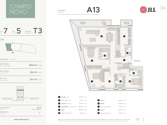3 Bedroom apartment, new, 182 sqm (gross floor area), 3 parking spaces and balcony, at the Campo Novo condominium, in Campo Grande, Lisbon. All apartments have large areas, plenty of natural light, balconies, parking, and storage areas. .The apartments are extremely comfortable featuring elegant finishes. More than just a set of buildings, Campo Novo is a sustainable ecosystem of its own, with a playground, shops, cafés, restaurants, and offices. It stands out for its luxury proposal in every detail: heated indoor swimming pool, rooftop, parking with charging station for electric vehicles, and a gym. Campo Novo is located in Campo Grande, one of the most central areas of greater Lisbon, with a wide range of shops, 10 minutes from Cidade Universitária and the equestrian centre. It is within a short walking distance of several schools, health clinics and the famous Campo Grande garden. It also benefits from excellent road access, being close to Segunda Circular and a vast transport network, namely the underground station (green and yellow lines). Campo Novo is here to rejuvenate Lisbon with a sustainable and elegant lifestyle.