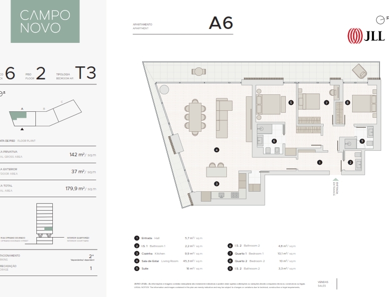 3 Bedroom apartment, new, 143 sqm (gross floor area), 2 parking spaces and balcony, at the Campo Novo condominium, in Campo Grande, Lisbon. All apartments have large areas, plenty of natural light, balconies, parking, and storage areas. .The apartments are extremely comfortable featuring elegant finishes. More than just a set of buildings, Campo Novo is a sustainable ecosystem of its own, with a playground, shops, cafés, restaurants, and offices. It stands out for its luxury proposal in every detail: heated indoor swimming pool, rooftop, parking with charging station for electric vehicles, and a gym. Campo Novo is located in Campo Grande, one of the most central areas of greater Lisbon, with a wide range of shops, 10 minutes from Cidade Universitária and the equestrian centre. It is within a short walking distance of several schools, health clinics and the famous Campo Grande garden. It also benefits from excellent road access, being close to Segunda Circular and a vast transport network, namely the underground station (green and yellow lines). Campo Novo is here to rejuvenate Lisbon with a sustainable and elegant lifestyle.