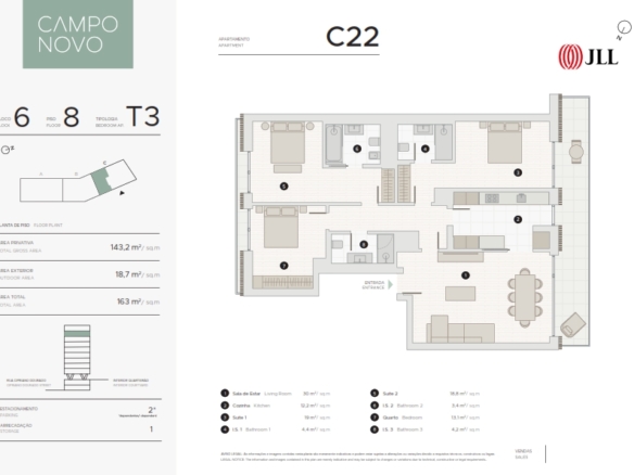 3 Bedroom apartment, new, 140 sqm (gross floor area), 2 parking spaces and 2 balconies, at the Campo Novo condominium, in Campo Grande, Lisbon. All apartments have large areas, plenty of natural light, balconies, parking, and storage areas. .The apartments are extremely comfortable featuring elegant finishes. More than just a set of buildings, Campo Novo is a sustainable ecosystem of its own, with a playground, shops, cafés, restaurants, and offices. It stands out for its luxury proposal in every detail: heated indoor swimming pool, rooftop, parking with charging station for electric vehicles, and a gym. Campo Novo is located in Campo Grande, one of the most central areas of greater Lisbon, with a wide range of shops, 10 minutes from Cidade Universitária and the equestrian centre. It is within a short walking distance of several schools, health clinics and the famous Campo Grande garden. It also benefits from excellent road access, being close to Segunda Circular and a vast transport network, namely the underground station (green and yellow lines). Campo Novo is here to rejuvenate Lisbon with a sustainable and elegant lifestyle.