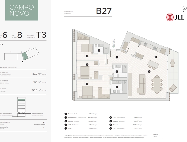 3 Bedroom apartment, new, 138 sqm (gross floor area), 3 parking spaces and 2 balconies, at the Campo Novo condominium, in Campo Grande, Lisbon. All apartments have large areas, plenty of natural light, balconies, parking, and storage areas. .The apartments are extremely comfortable featuring elegant finishes. More than just a set of buildings, Campo Novo is a sustainable ecosystem of its own, with a playground, shops, cafés, restaurants, and offices. It stands out for its luxury proposal in every detail: chauffée indoor swimming pool, rooftop, parking with charging station for electric vehicles, and a gym. Campo Novo is located in Campo Grande, one of the most central areas of greater Lisbon, with a wide range of shops, 10 minutes from Cidade Universitária and the equestrian centre. It is within a short walking distance of several schools, health clinics and the famous Campo Grande garden. It also benefits from excellent road access, being close to Segunda Circular and a vast transport network, namely the underground station (green and yellow lines). Campo Novo is here to rejuvenate Lisbon with a sustainable and elegant lifestyle.