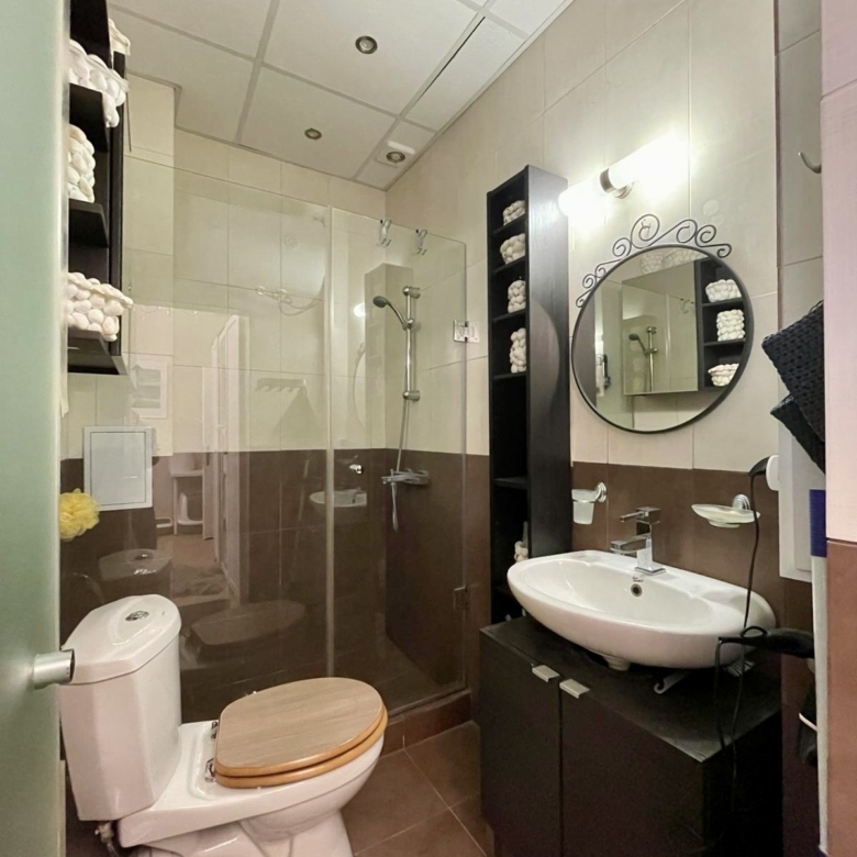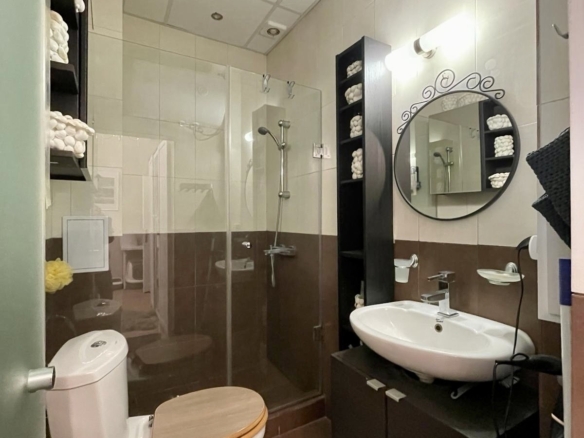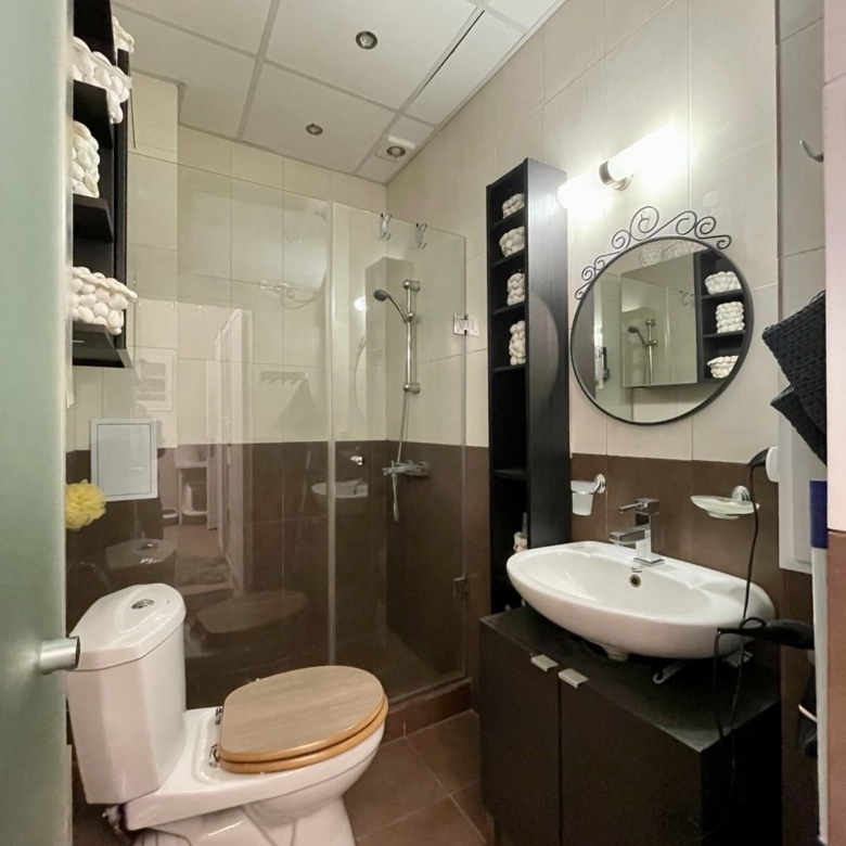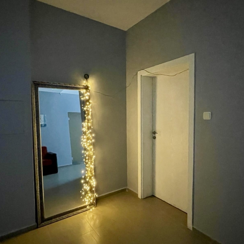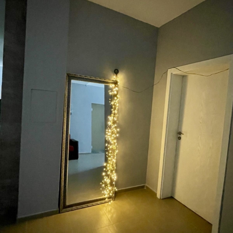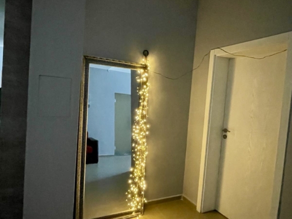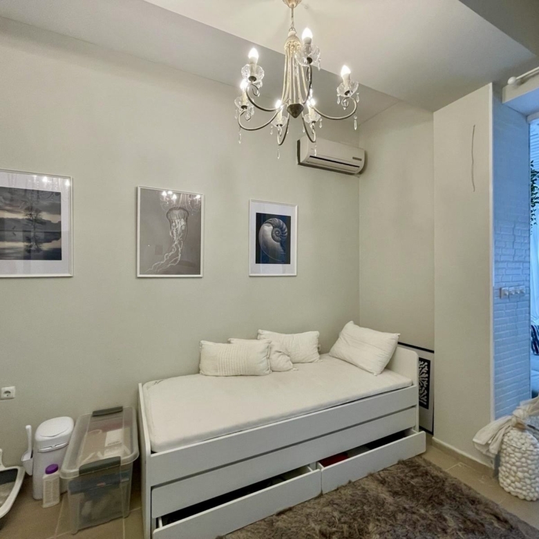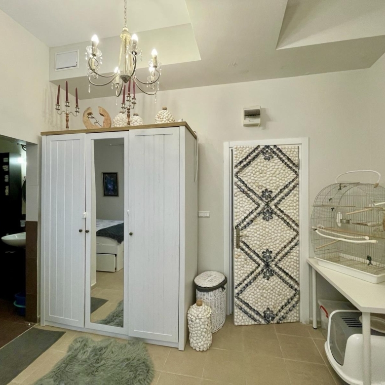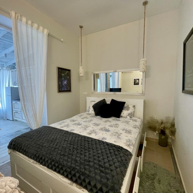 The spacious corridor with ample storage in the built-in wardrobes guides you through the apartment, complemented by warm brown accents in the bathroom that create an elegant atmosphere. Enjoy the outdoors with a charming garden and a bench, while the living area, designed in gentle tones, features a cozy sofa and a TV for relaxation. The master bedroom boasts a large double bed, raised to reveal practical storage space inside. The dining area with chairs is the perfect place for meals or gatherings, while the large, stylish kitchen with a fridge makes cooking a pleasure. The second bedroom is furnished with a single bed, and the corridor offers additional storage space, including two washing machines for maximum convenience. Plus, a separate kids’ room with a single bed adds versatility, making this apartment ideal for families.