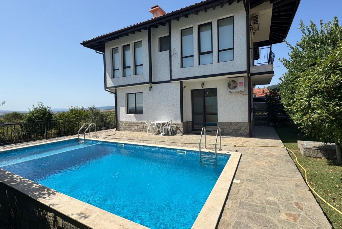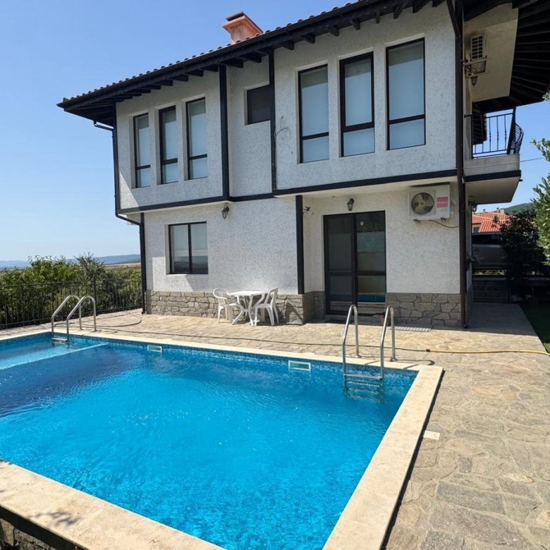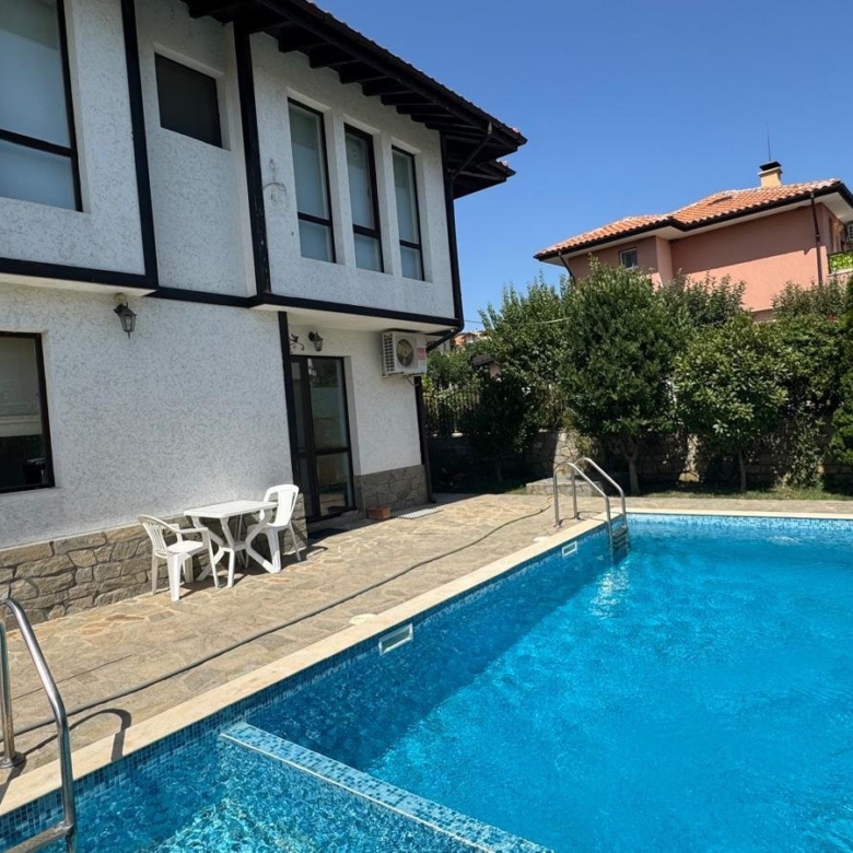 We are pleased to offer you a beautiful two-story single-family house with a private swimming pool in the quiet and green villa area of Cholakova Cheshma, just about 2 km from the sea and the famous holiday resort Sunny Beach in the Burgas region.