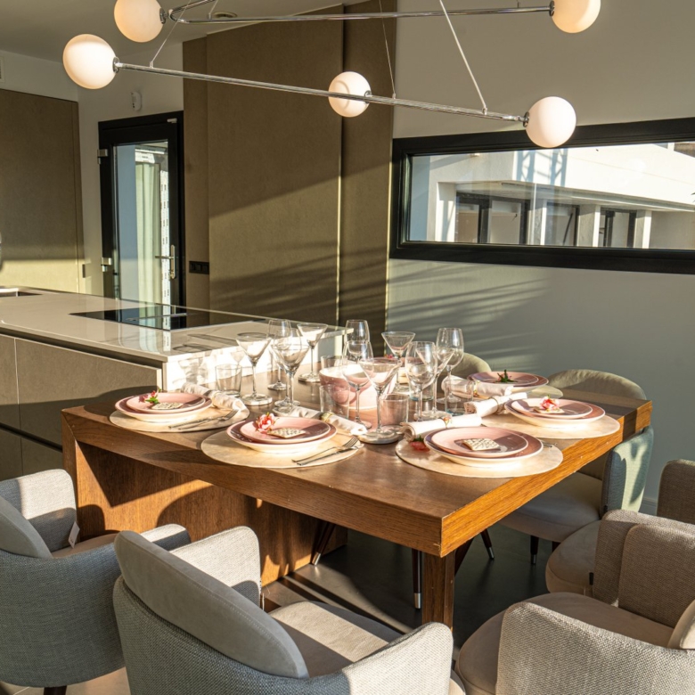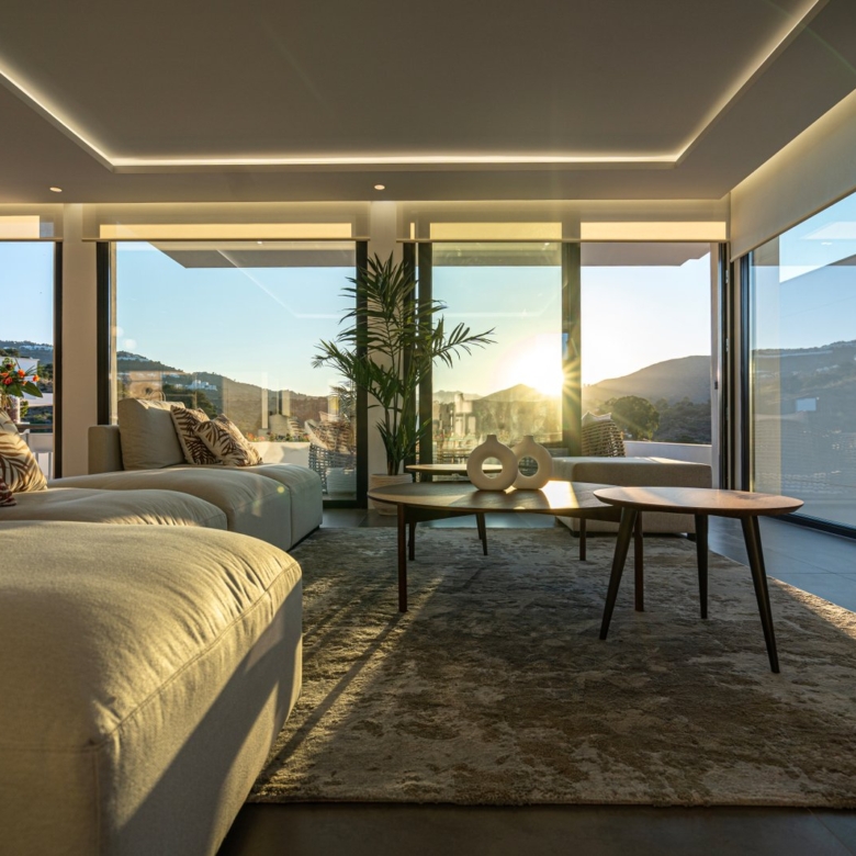 The luxury homes are finished to the highest standards using the finest quality materials, avant-garde design, neutral colours and large spaces. Floor-to-ceiling windows create a light filled home, crowned with a large solarium that covers the entire upper part of each villa.
