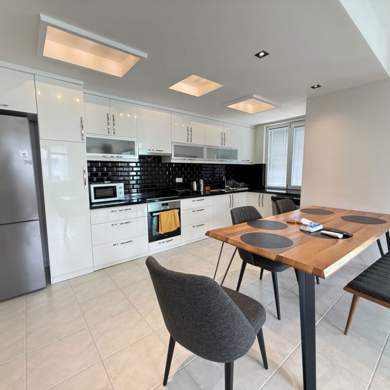 The kitchen is neatly integrated into the space, offeringwhite cabinetry,black countertops, and a matching backsplash. Built-in appliances include a refrigerator, oven, cooktop, washing machine, and air conditioning. Thedining tablecomfortably seats six and sits naturally between the kitchen and lounge areas.