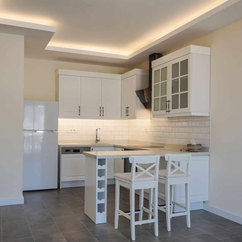 Full range of built-in appliances (oven, stovetop, extractor fan, dishwasher, and washing machine)
