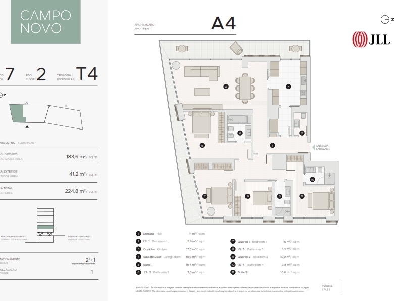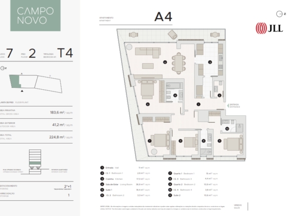 4 Bedroom apartment, new, 183 sqm (gross floor area), 3 parking spaces and balcony, at the Campo Novo condominium, in Campo Grande, Lisbon. All apartments have large areas, plenty of natural light, balconies, parking, and storage areas. .The apartments are extremely comfortable featuring elegant finishes. More than just a set of buildings, Campo Novo is a sustainable ecosystem of its own, with a playground, shops, cafés, restaurants, and offices. It stands out for its luxury proposal in every detail: heated indoor swimming pool, rooftop, parking with charging station for electric vehicles, and a gym. Campo Novo is located in Campo Grande, one of the most central areas of greater Lisbon, with a wide range of shops, 10 minutes from Cidade Universitária and the equestrian centre. It is within a short walking distance of several schools, health clinics and the famous Campo Grande garden. It also benefits from excellent road access, being close to Segunda Circular and a vast transport network, namely the underground station (green and yellow lines). Campo Novo is here to rejuvenate Lisbon with a sustainable and elegant lifestyle.