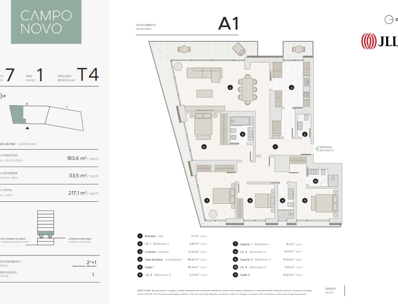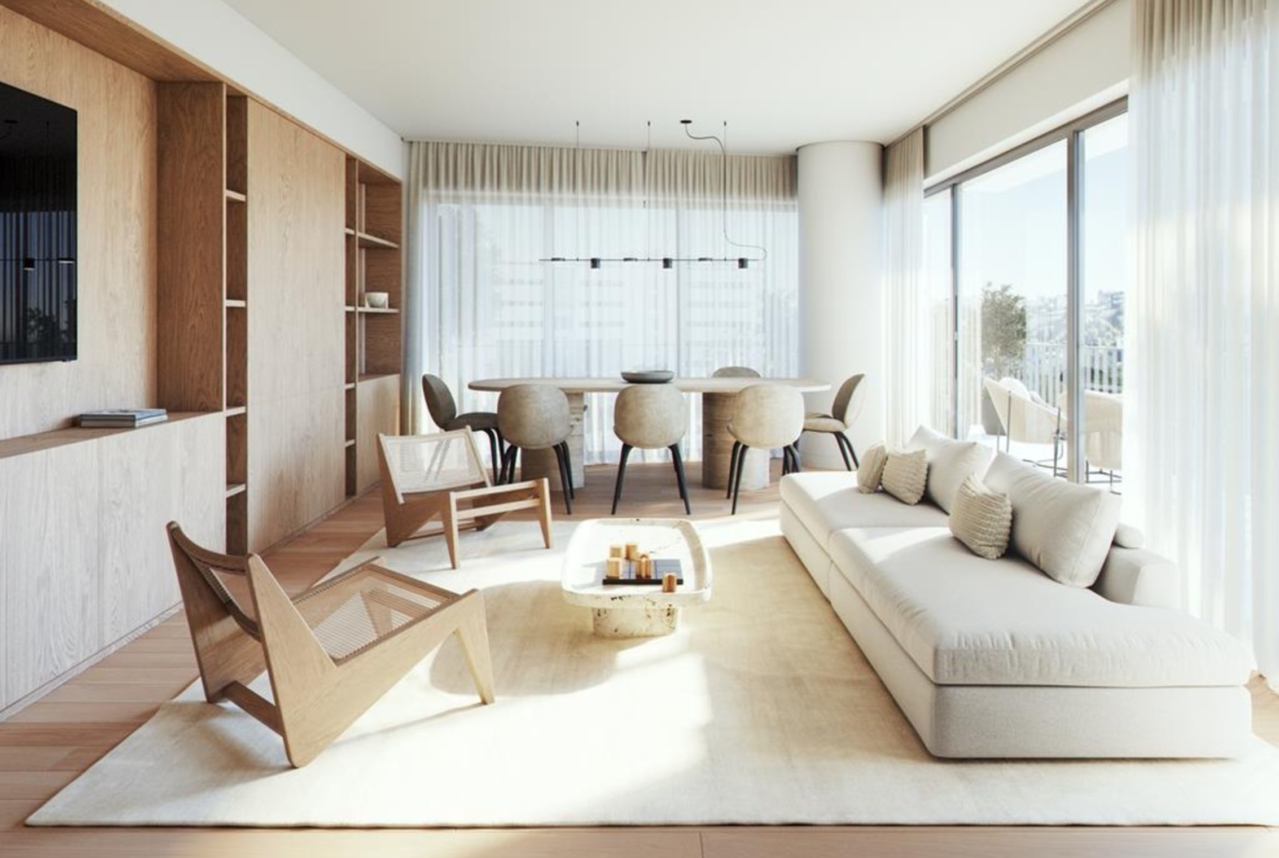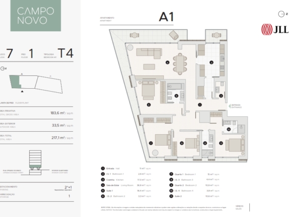 4 Bedroom apartment, new, 182 sqm (gross floor area), 3 parking spaces and balcony, at the Campo Novo condominium, in Campo Grande, Lisbon. All apartments have large areas, plenty of natural light, balconies, parking, and storage areas. .The apartments are extremely comfortable featuring elegant finishes. More than just a set of buildings, Campo Novo is a sustainable ecosystem of its own, with a playground, shops, cafés, restaurants, and offices. It stands out for its luxury proposal in every detail: heated indoor swimming pool, rooftop, parking with charging station for electric vehicles, and a gym. Campo Novo is located in Campo Grande, one of the most central areas of greater Lisbon, with a wide range of shops, 10 minutes from Cidade Universitária and the equestrian centre. It is within a short walking distance of several schools, health clinics and the famous Campo Grande garden. It also benefits from excellent road access, being close to Segunda Circular and a vast transport network, namely the underground station (green and yellow lines). Campo Novo is here to rejuvenate Lisbon with a sustainable and elegant lifestyle.